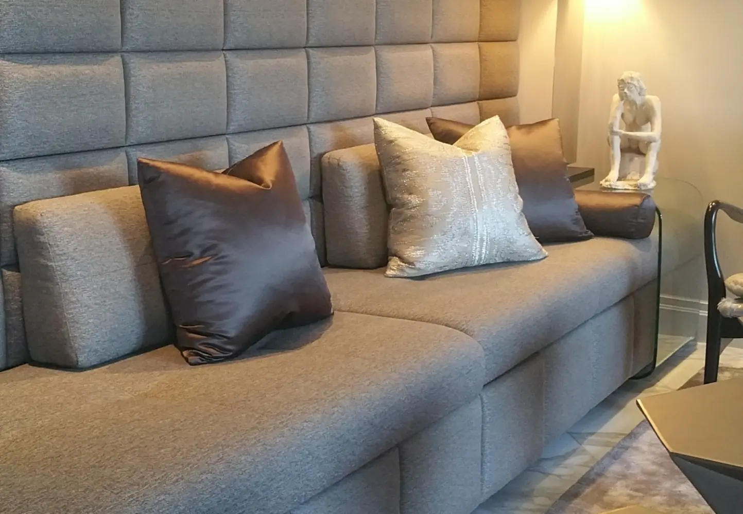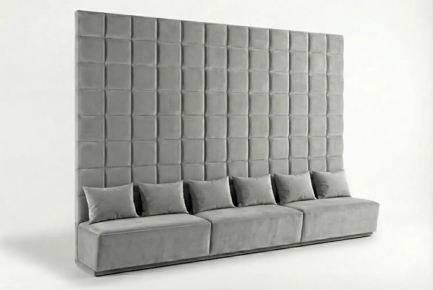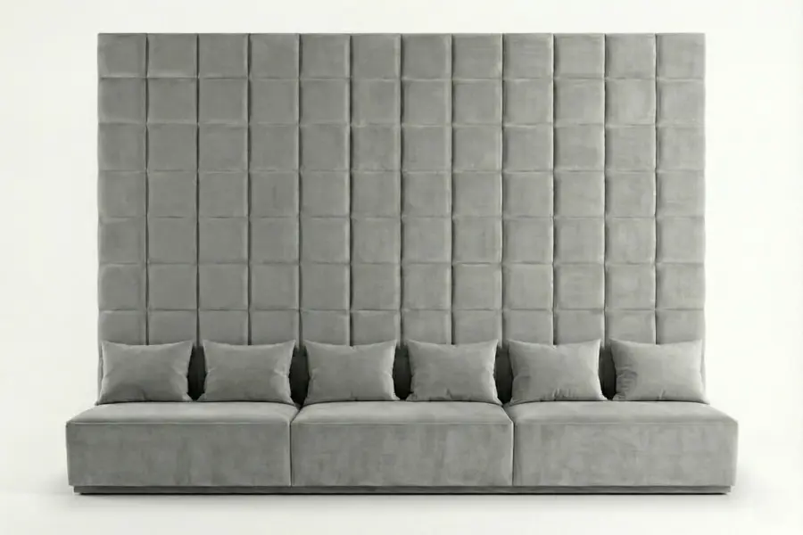 The Altus Custom Banquette delivers a commanding architectural presence, designed to transform any vertical surface into a refined, floor-to-ceiling statement. Its dramatic scale and grid-tufted back create a strong visual structure, while the tailored proportions allow it to function seamlessly within luxury residential, hospitality, or commercial interiors. Whether configured as a monolithic straight run or a precision-crafted L-shape, the Altus offers both impact and performance.