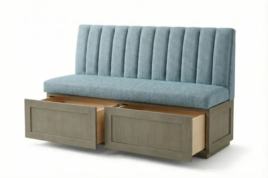 The Hawthorne Dining Banquette combines tailored sophistication with practical functionality. Its striking vertical channel tufted back adds texture and visual rhythm, while the solid wood base integrates smart storage drawers for a seamless blend of style and utility. Designed to fit your space perfectly, this banquette can be fully customized in length, orientation, and configuration, making it ideal for bespoke dining areas or high-end hospitality interiors.