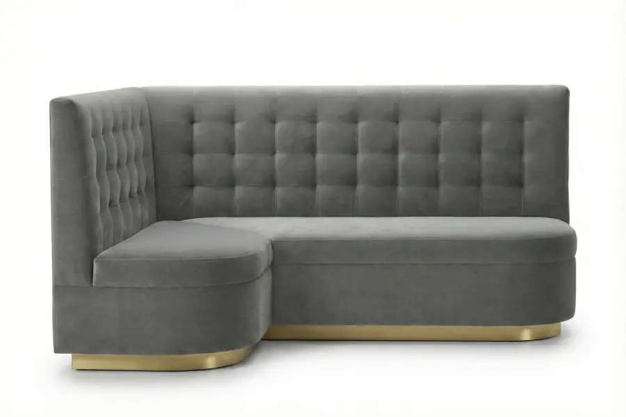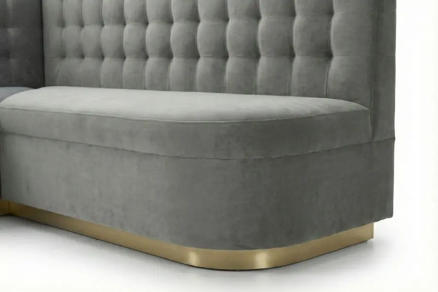 The Savoy Dining Banquette combines refined comfort with architectural presence, featuring an elegant biscuit-tufted back and a gracefully rounded silhouette. A striking metallic plinth base grounds the design, creating a modern yet timeless statement suitable for upscale dining rooms, hospitality spaces, and custom residential interiors. Its tailored proportions and sculptural form provide both visual impact and exceptional seating comfort.
