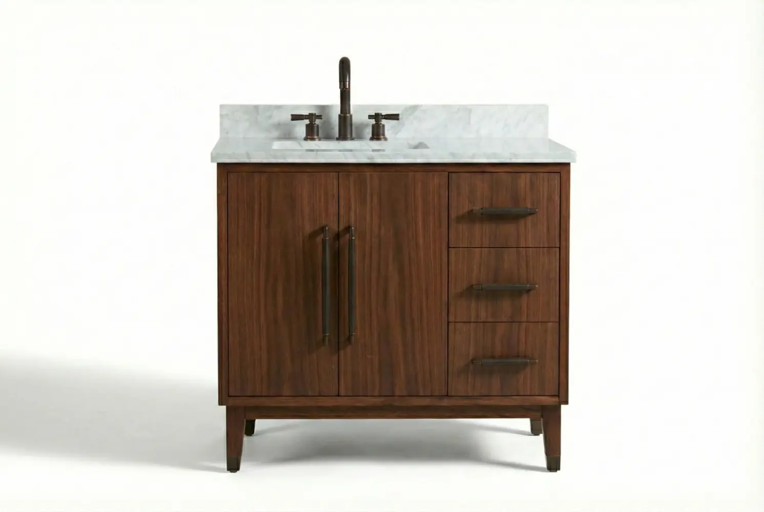The Noce Classico Single Vanity exudes timeless refinement, defined by its rich dark wood grain and bronze-finished hardware. Elegant proportions and classic detailing create a sophisticated presence suited to both traditional and transitional bath interiors.