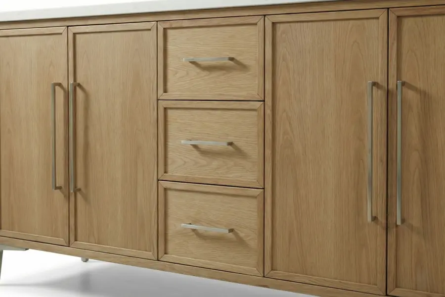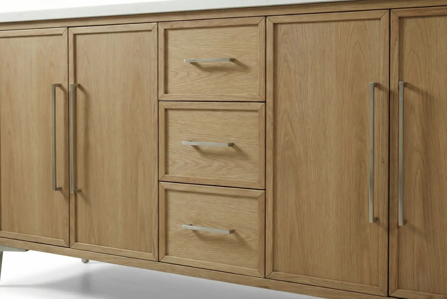 Fully customizable, clients may specify bespoke dimensions, alternative wood species, and tailored finishes. The stone top, sinks, and faucets are selected by the client and are not included, allowing complete creative freedom in defining the final expression of the space.