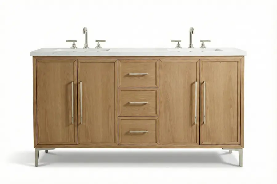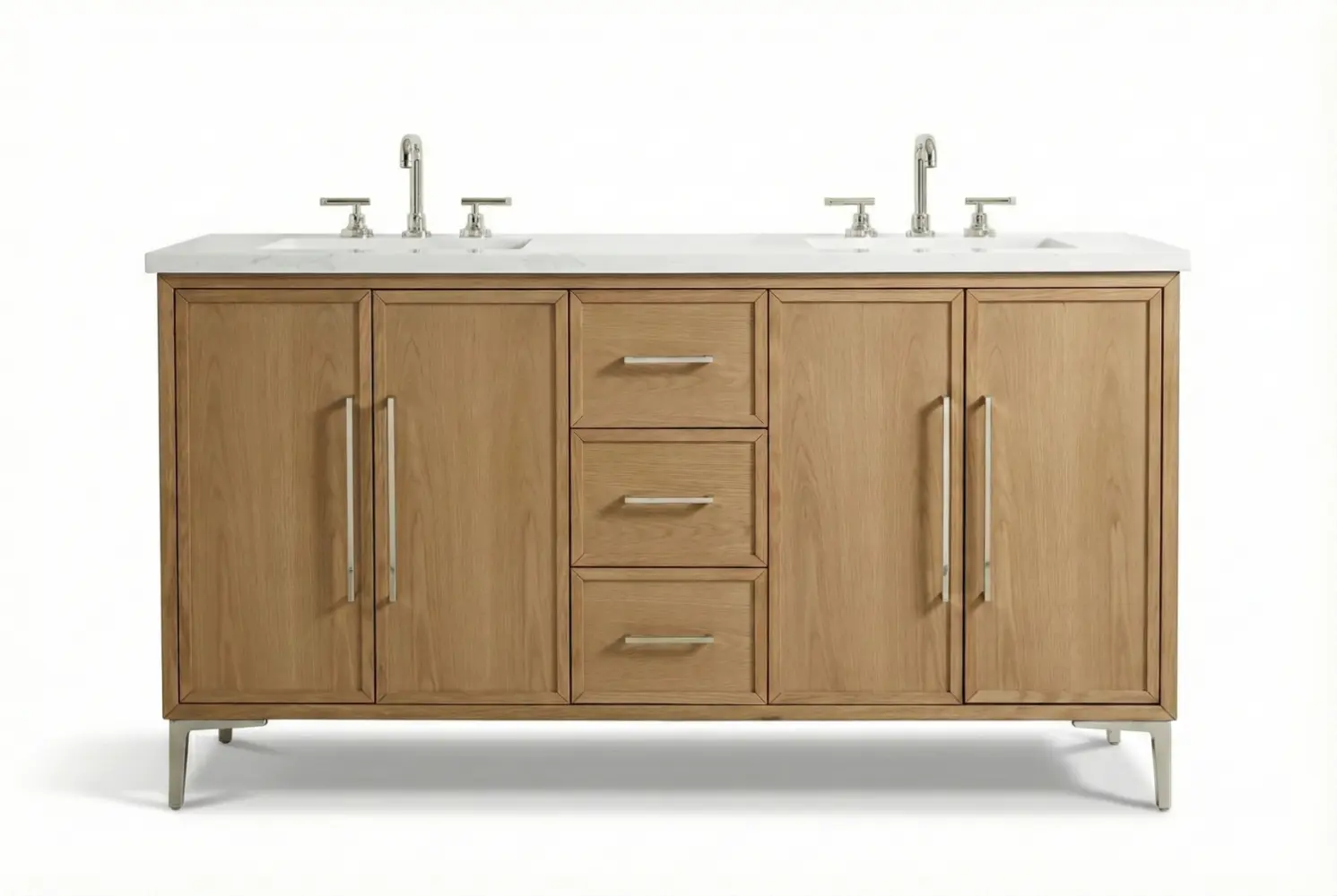 This sophisticated double vanity in rovere wood pairs organic warmth with clean, modern structure. Its balanced composition features generous central drawers flanked by side cabinets, offering refined and practical storage. Elevated on tapered metal legs, the design achieves an architectural lightness that enhances contemporary and transitional bath interiors.