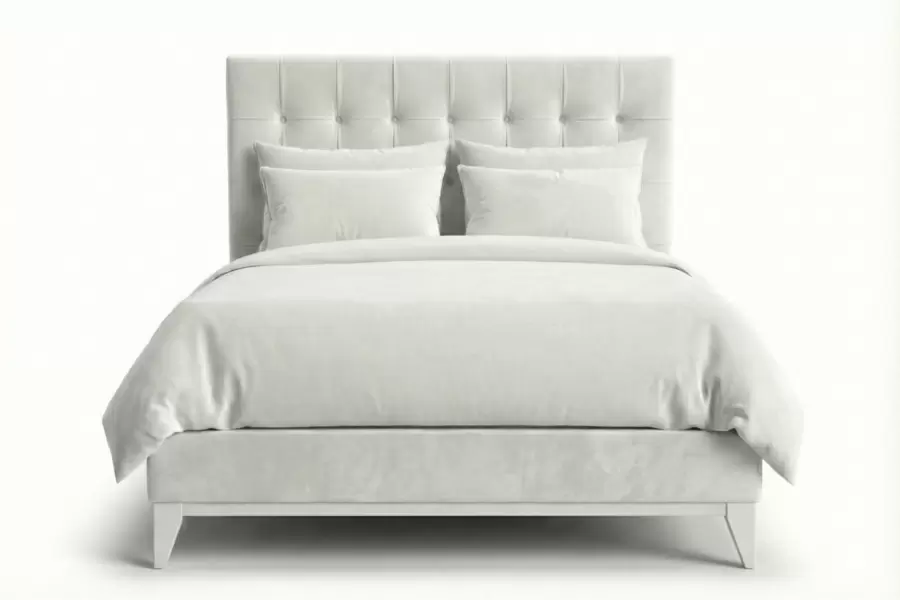 Exuding timeless elegance, the Benjamin Bed is defined by a 54-inch high, classic button-tufted headboard that creates a striking yet refined focal point. Its sleek, low-profile upholstered frame rests on tapered legs, lending lightness and balance to the design.