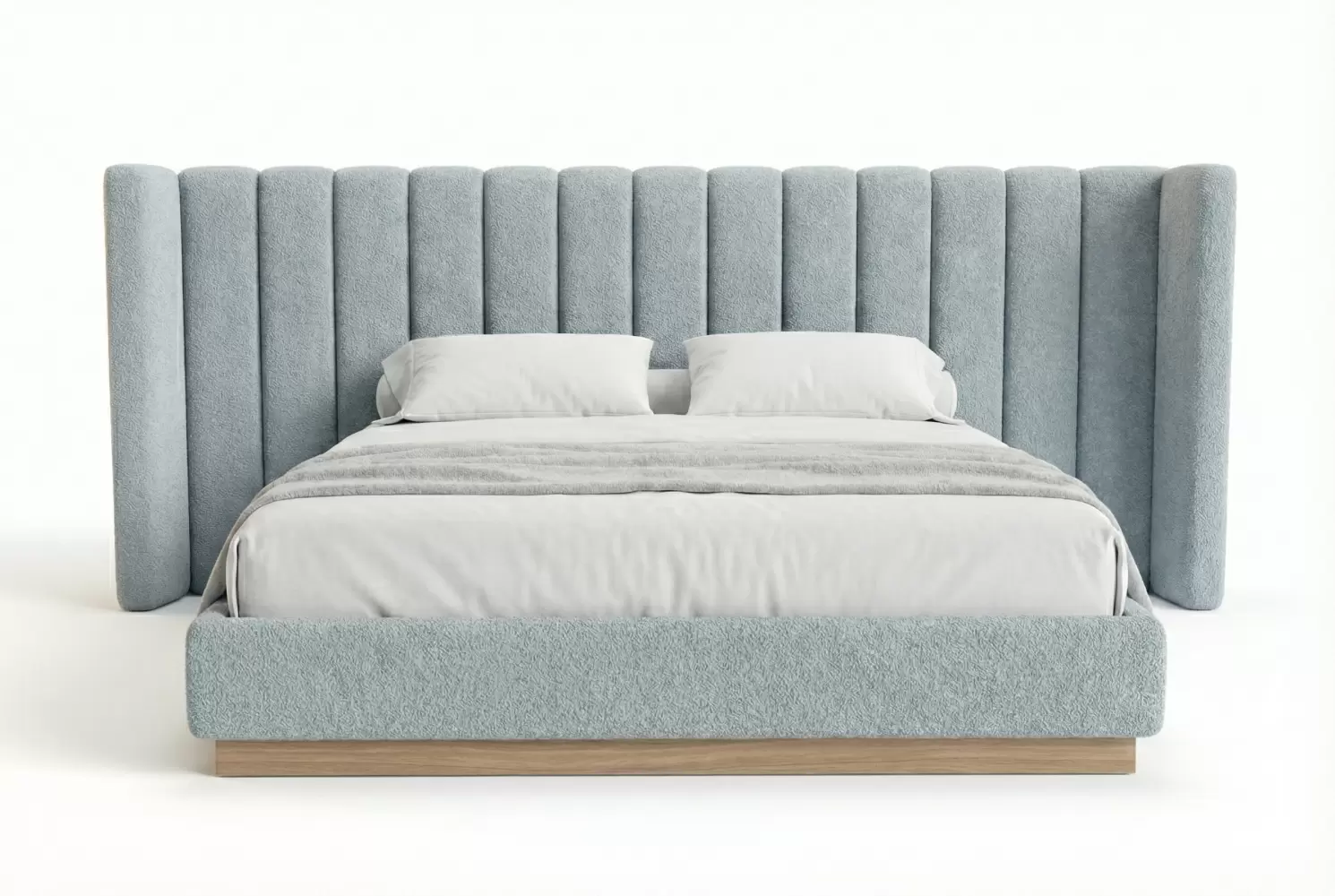 The Colonnade Bed makes a refined architectural statement with a grand, extended headboard featuring deep vertical channeling upholstered in plush, textured fabric. Its 48-inch high headboard delivers visual softness and rhythmic depth, while a floating wooden plinth base grounds the design with modern elegance.