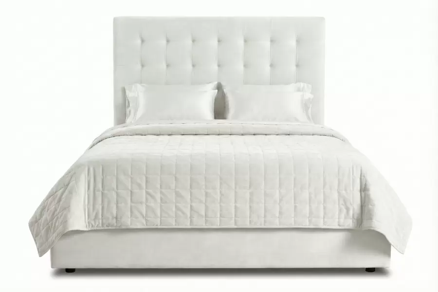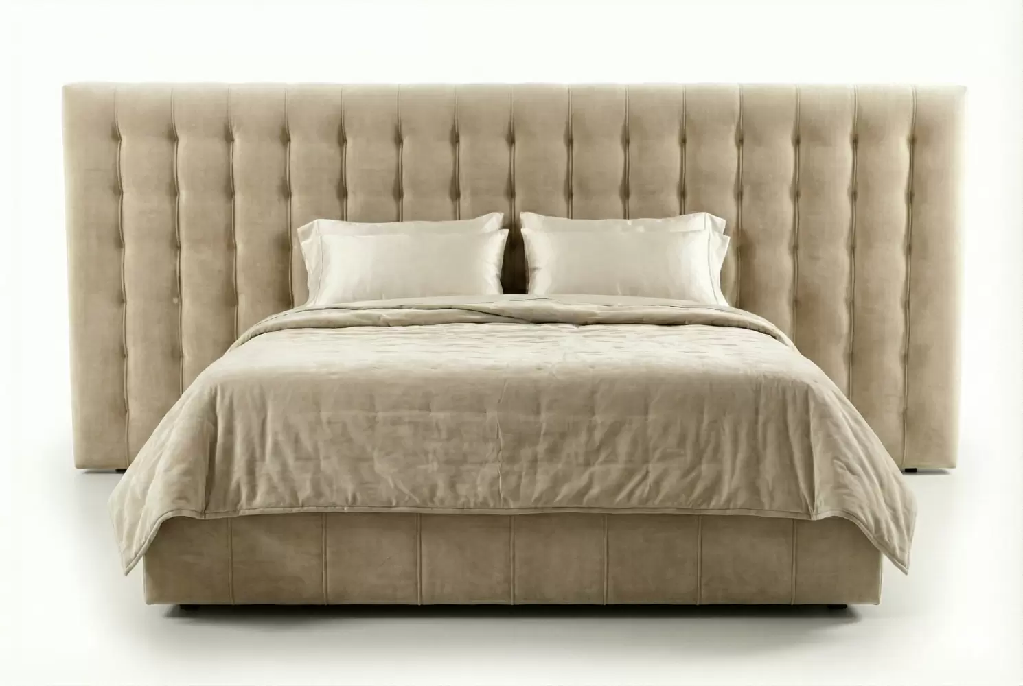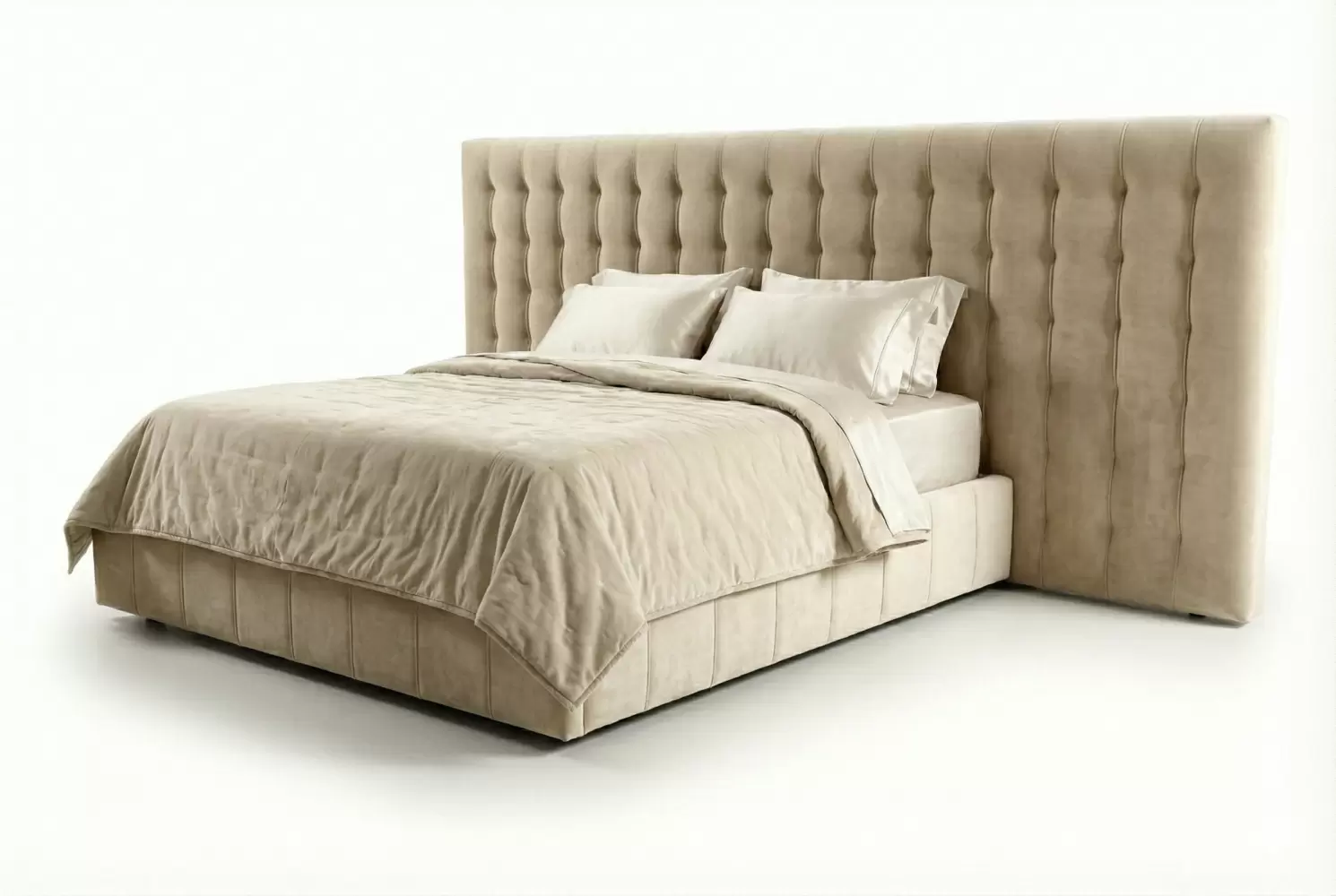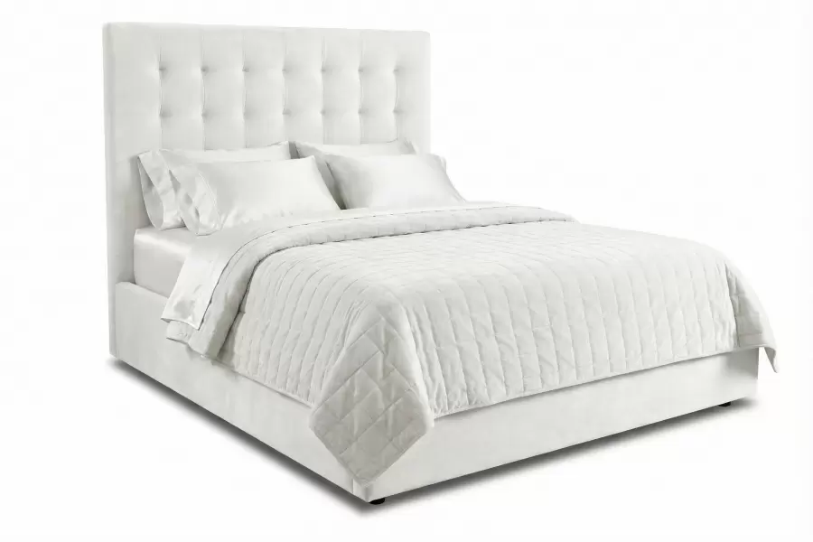 The Halsey Bed features a sculptural upholstered headboard and clean-lined frame, offering a sophisticated focal point for modern or transitional bedrooms. An optional extended headboard version creates a wider presence, seamlessly spanning behind night tables for a cohesive, designer-ready look.