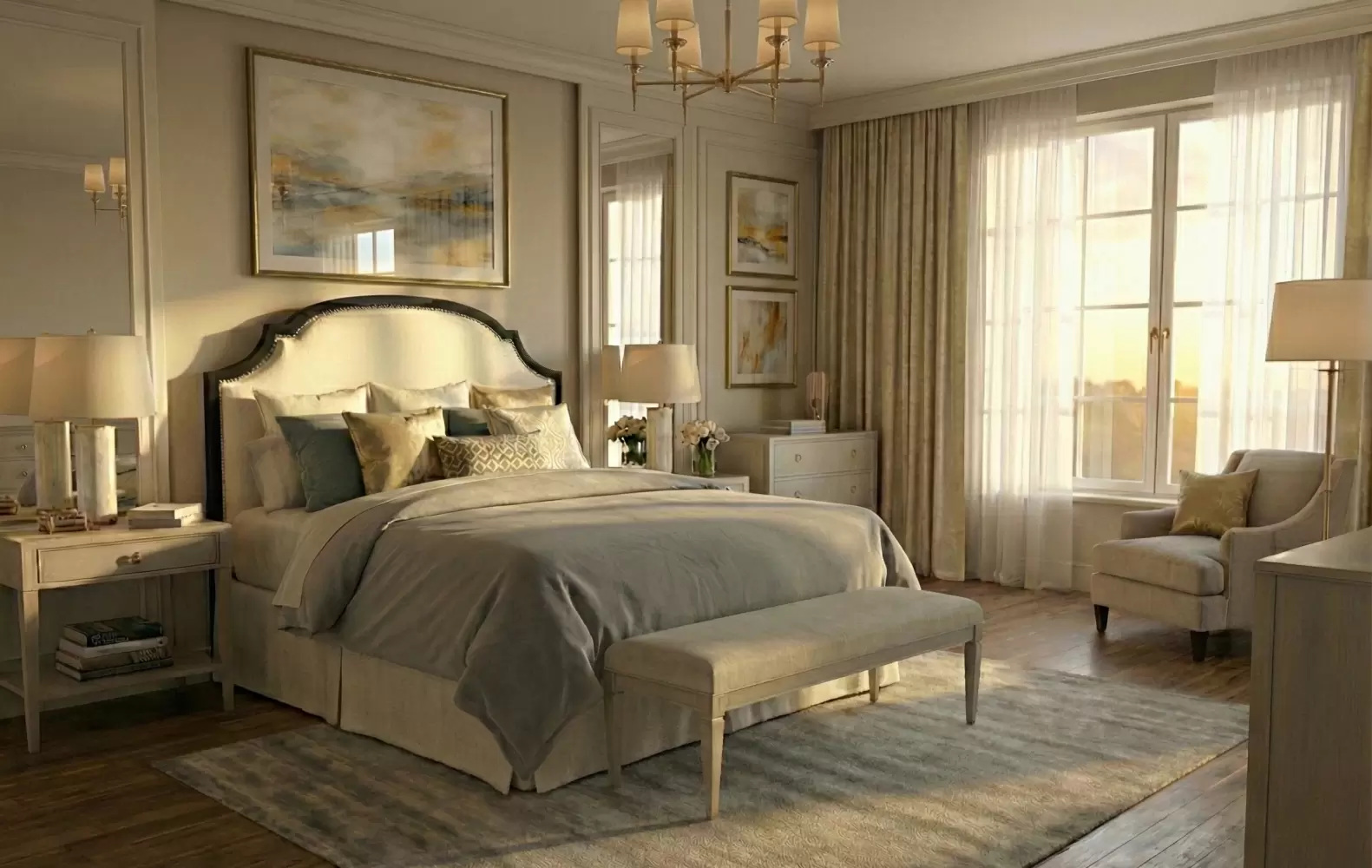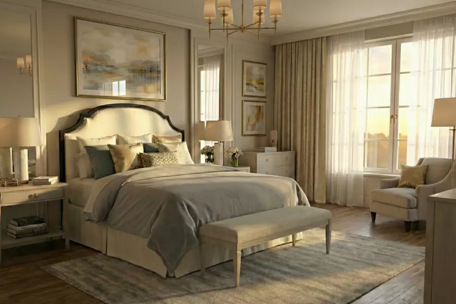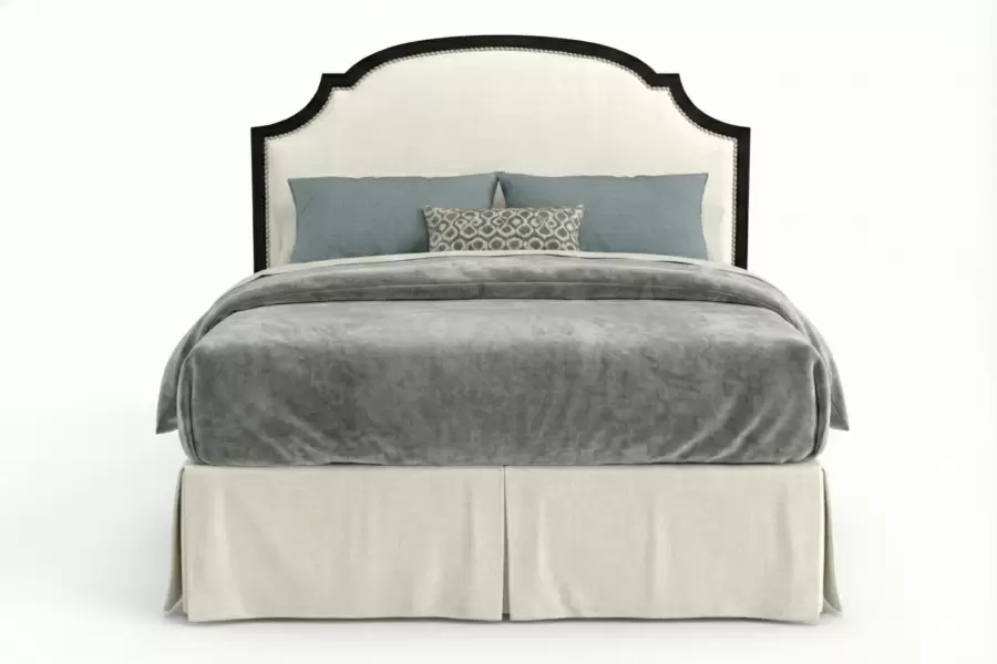 The Rector Wood Trim Bed blends upholstered comfort with the warm, architectural presence of refined wood detailing. Clean lines meet elegant wood trim framing the headboard and footboard, creating a striking bed that anchors both modern and transitional bedrooms.