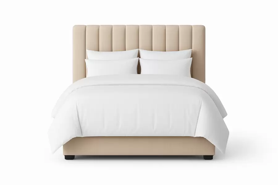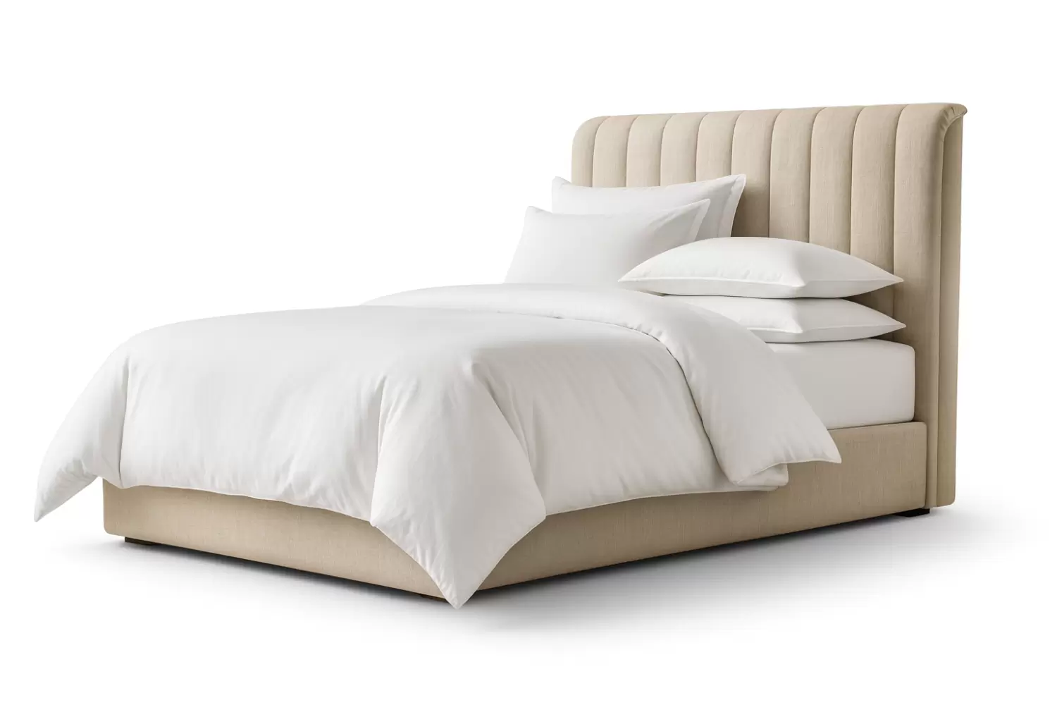 The Thompson Bed features a fully upholstered frame with a vertically channeled headboard, creating a clean, modern silhouette with subtle texture. Its low-profile platform and tailored proportions suit contemporary and transitional interiors, providing a versatile backdrop for designer bedding and accessories.