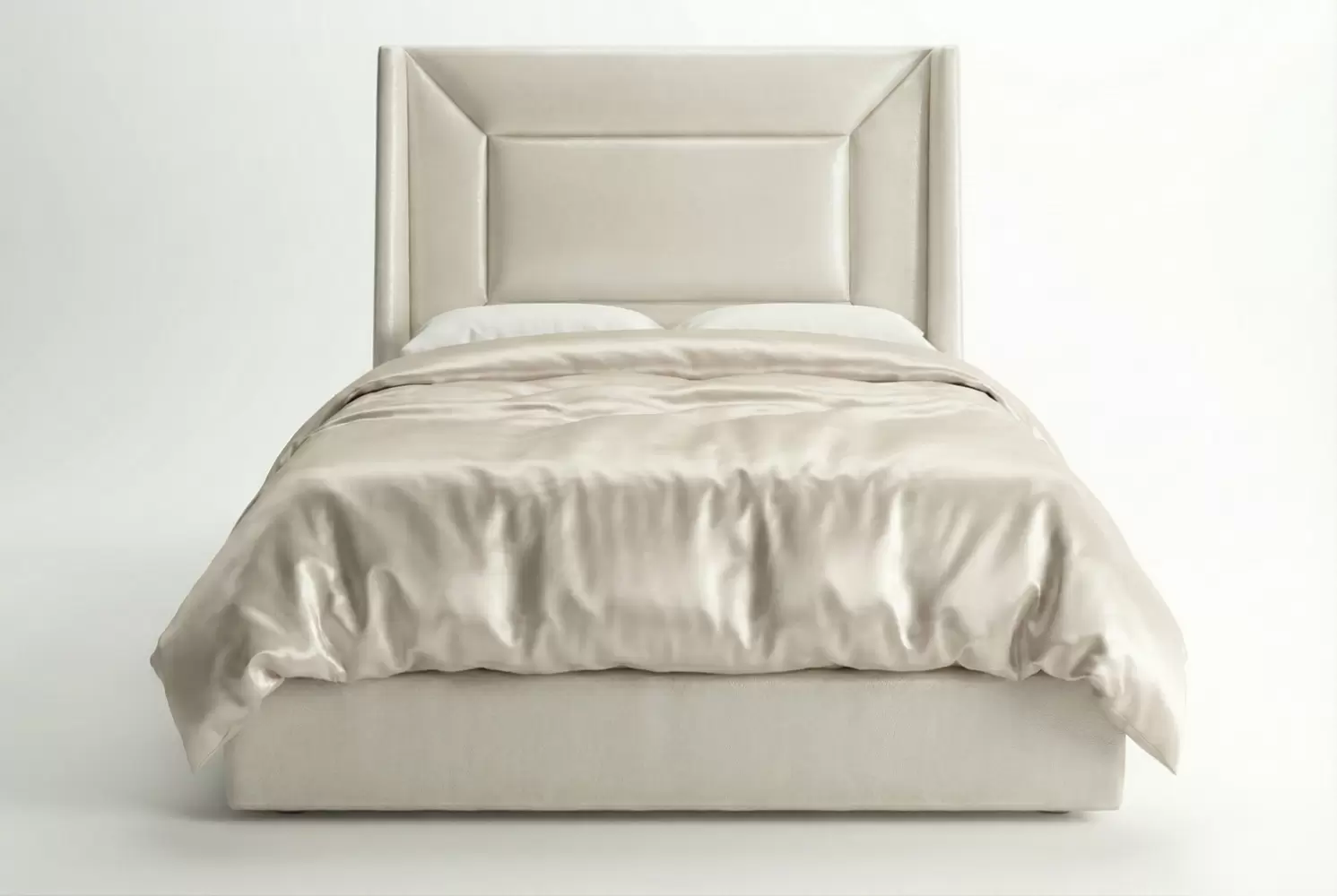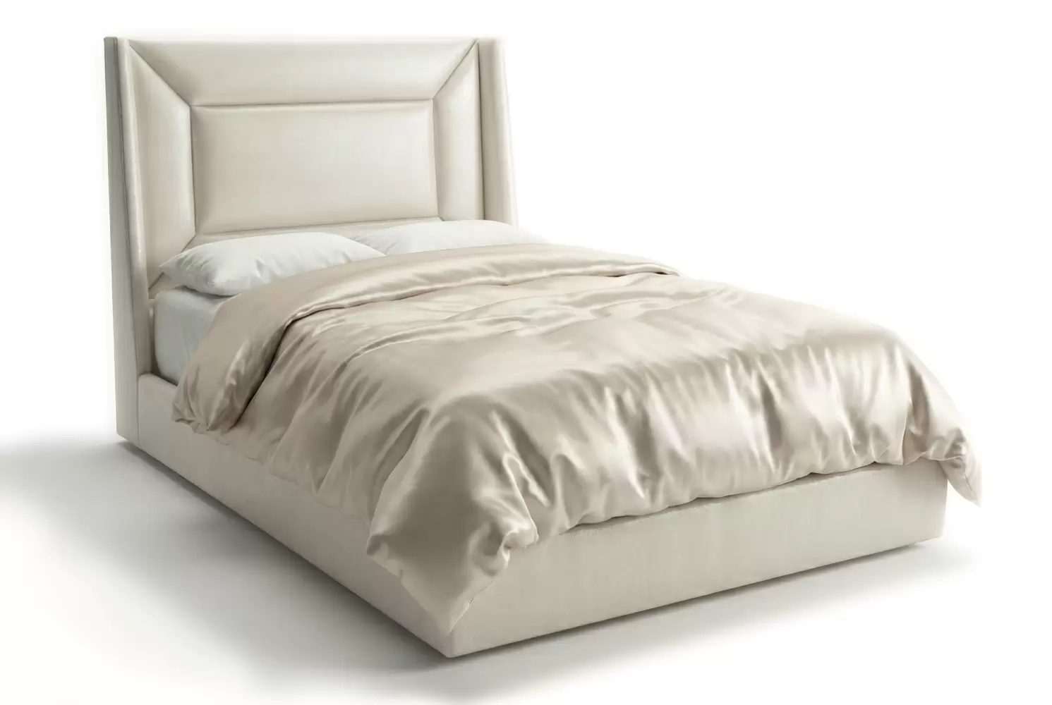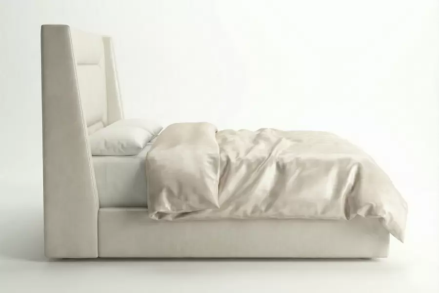 The West Bed defines modern architectural elegance with a crisp, beveled, and mitered headboard frame and a sheltered wingback profile. Fully upholstered in premium leathers or Customer’s Own Material (COM), it serves as a sophisticated bedroom centerpiece.