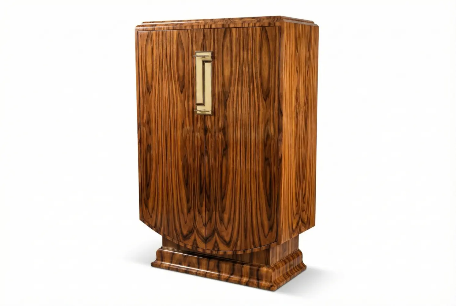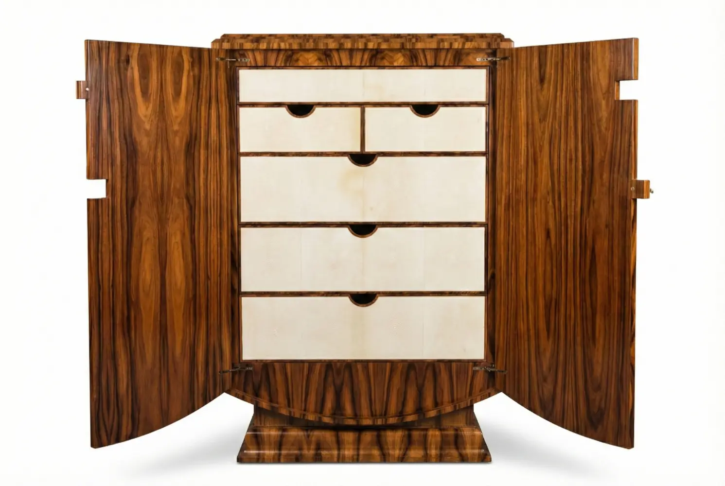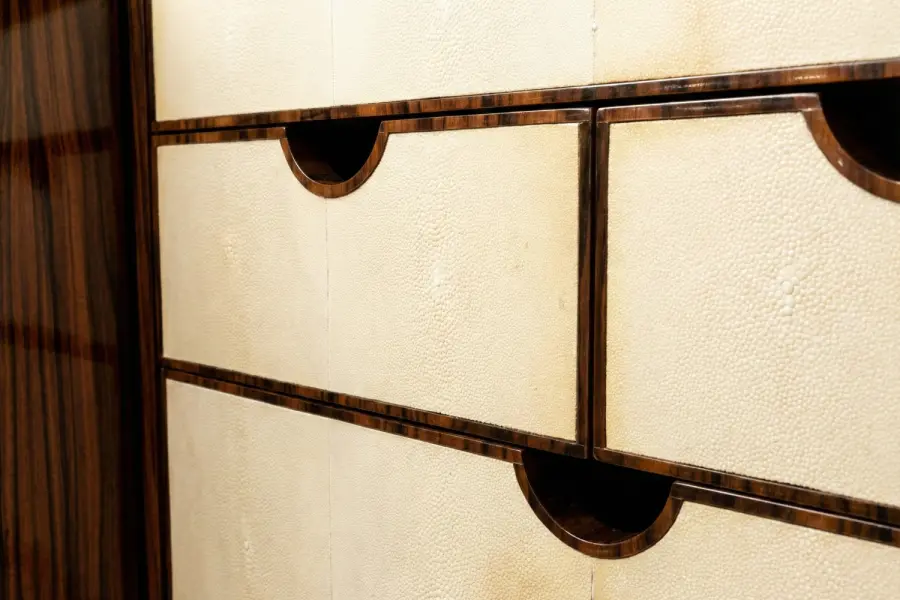 Channeling the opulence of 1930s Paris, the Montaigne Cabinet is a masterwork of French Art Deco design. Its sculptural silhouette is wrapped in hand-selected, book-matched Santos Rosewood finished in a luminous high-gloss lacquer. Inside, contrasting shagreen-faced drawers provide refined and bespoke storage.