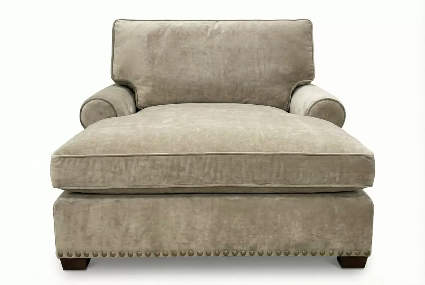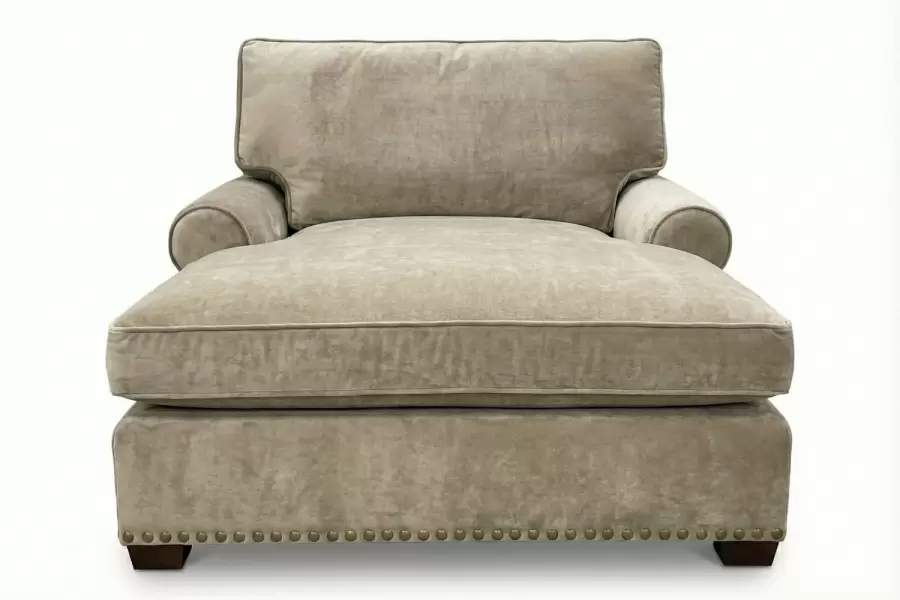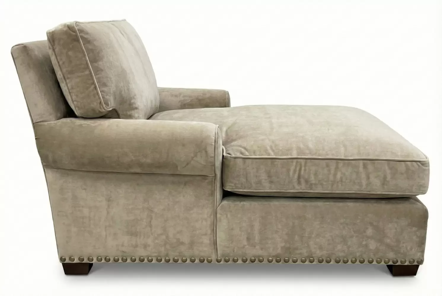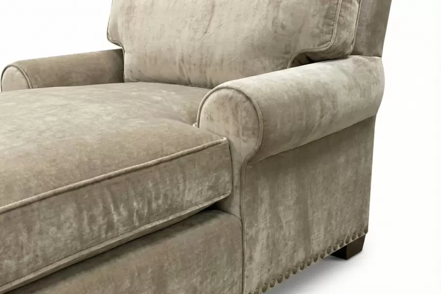 Rolled arms, box welt down and feather cushions, nail head trim and wooden wedge legs are some of the elements adorning the generously proportioned Gansevoort Chaise. All design elements are custom made.