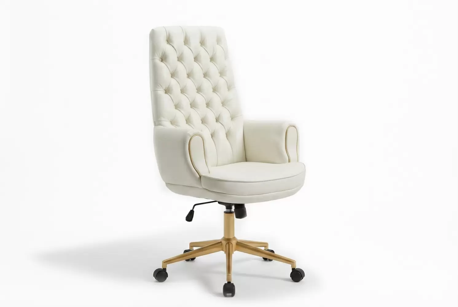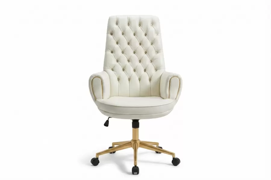 The Addison Chair is a beautifully custom upholstered diamond tufted high back chair, soft rolled arms with swivel legs and a single seat cushion. This chair embodies luxury and sophistication; the perfect addition to a residential or corporate office space. All metal finishes can be customized.
