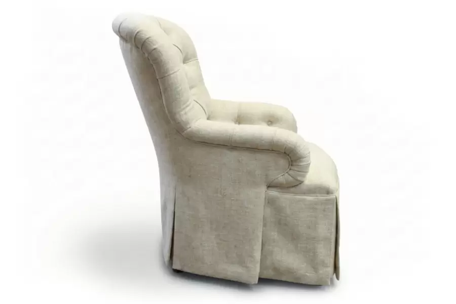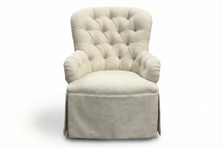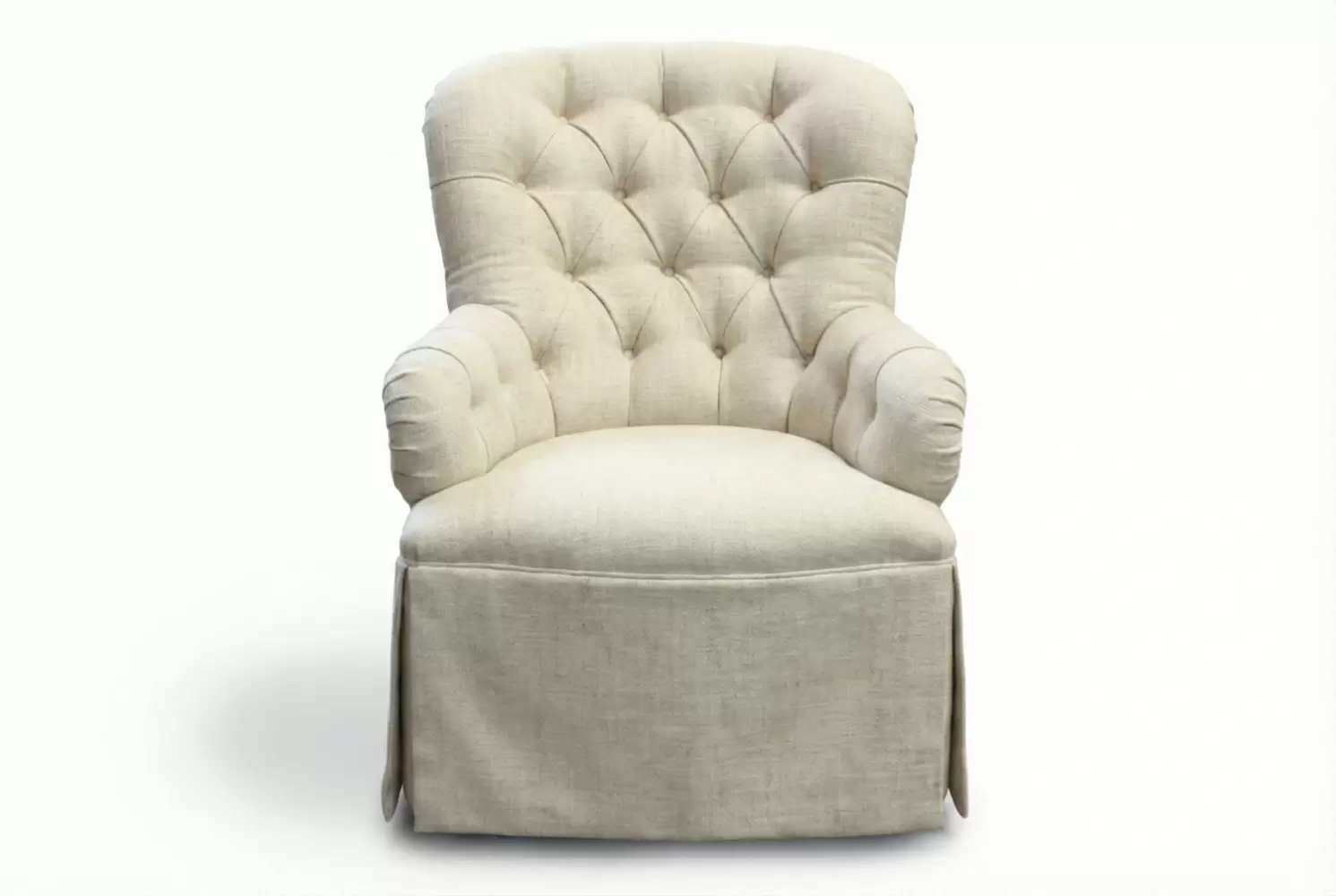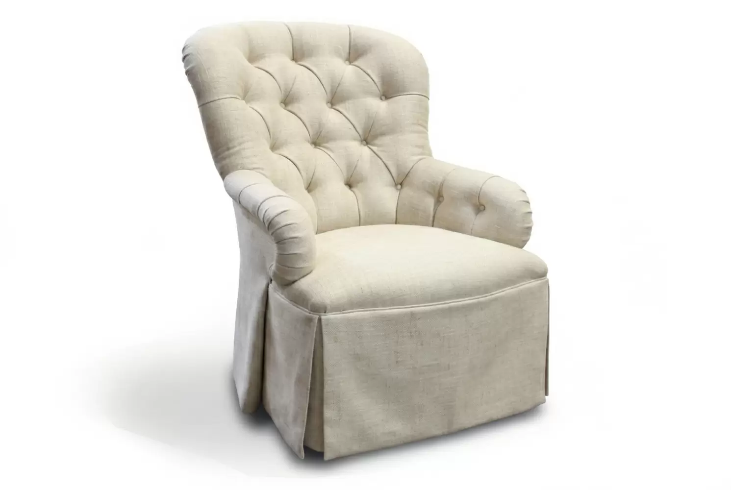 The Bergen chair is an elegant nod to traditionalism featuring a simple base skirt, diamond tufted back, an upholstered welted seat cushion and beautifully rounded arms.