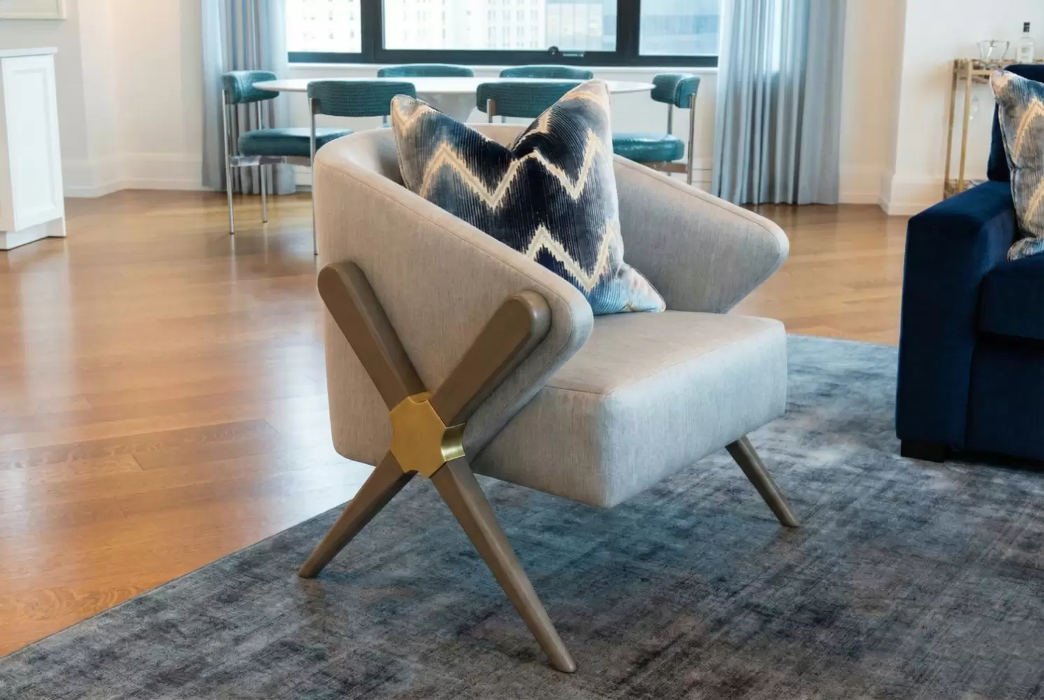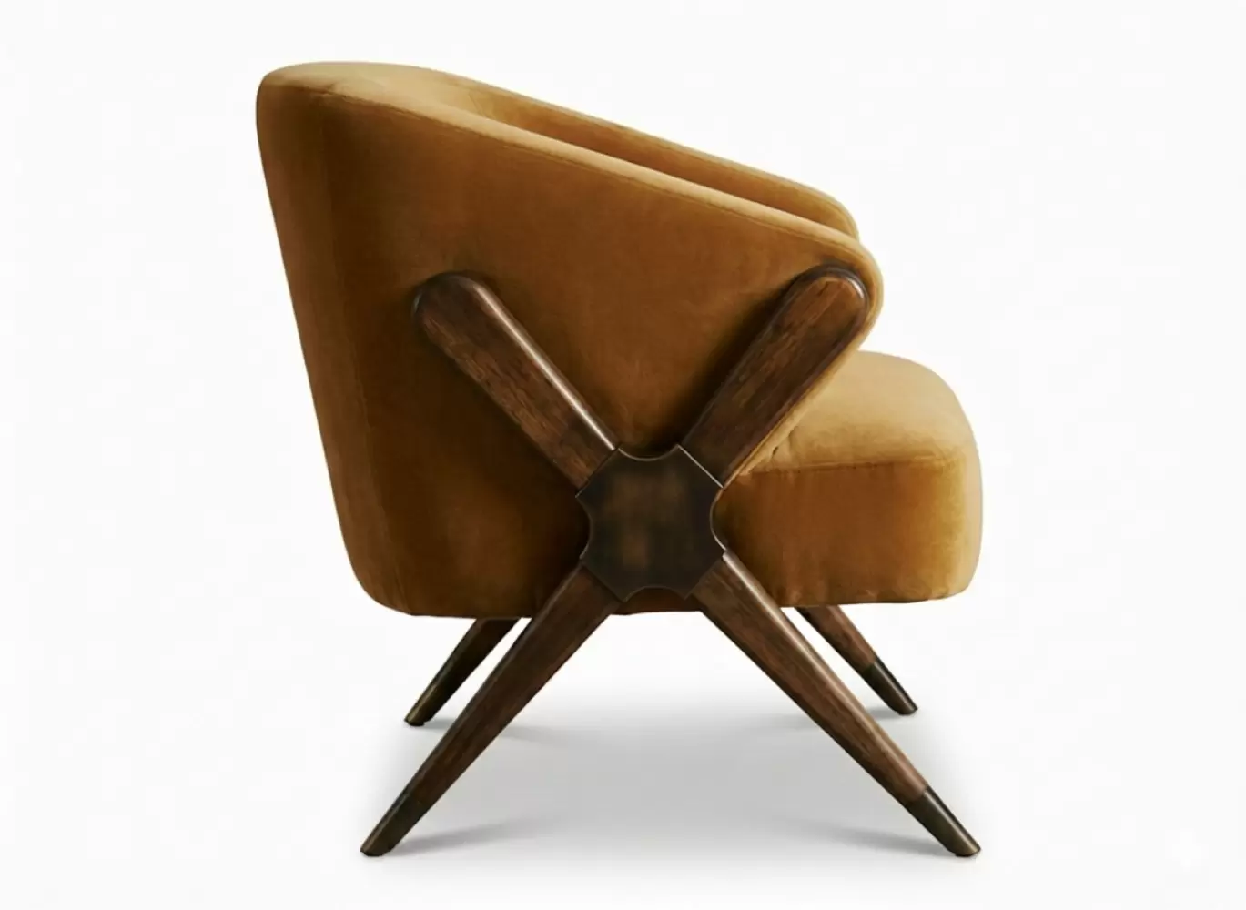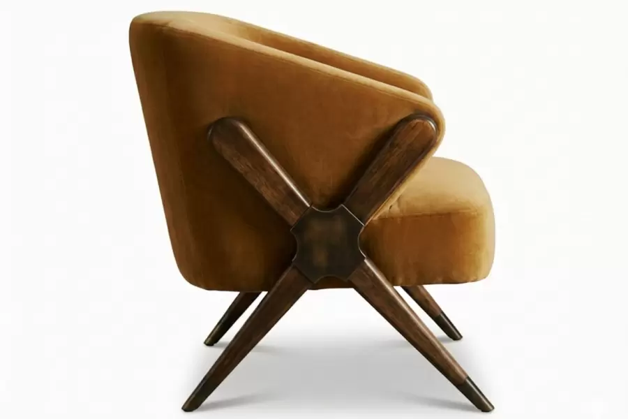 The Newton Tub Chair features a bold, geometric wood frame with an X-shaped side profile and tapered legs. Its curved seat and backrest offer sculptural comfort, making it a standout piece for modern or retro-inspired interiors. All dimensions and finishes are customizable