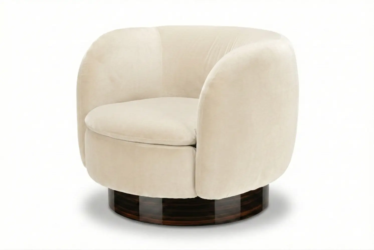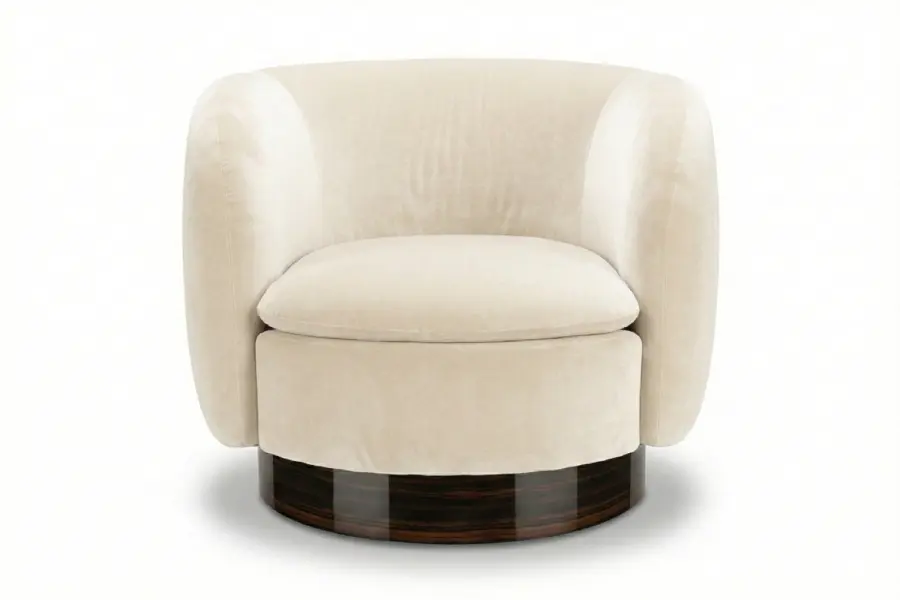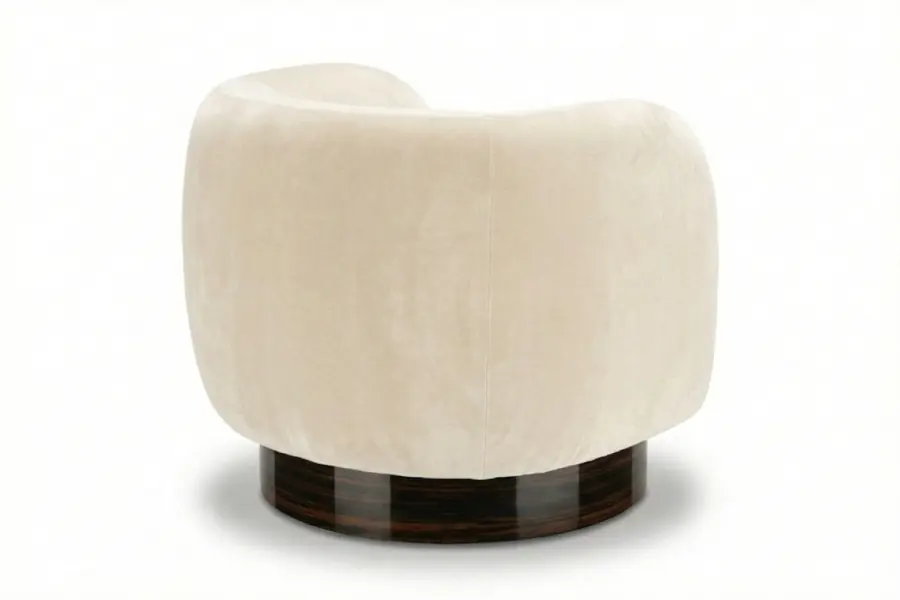 Anchored by a smooth swivel base, the Orvieto offers effortless movement paired with refined style. Crafted to order, the design can be tailored with custom finishes, dimensions, and upholstery selections, allowing this versatile chair to integrate seamlessly into lounge, living, or accent seating environments while maintaining its distinctive sculptural presence.