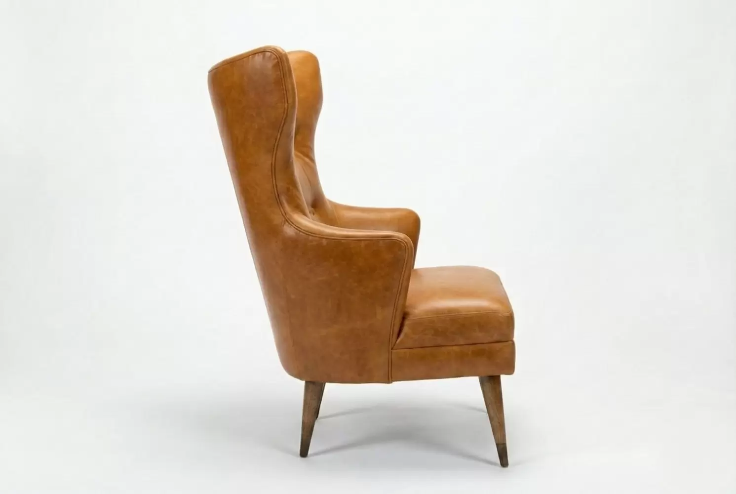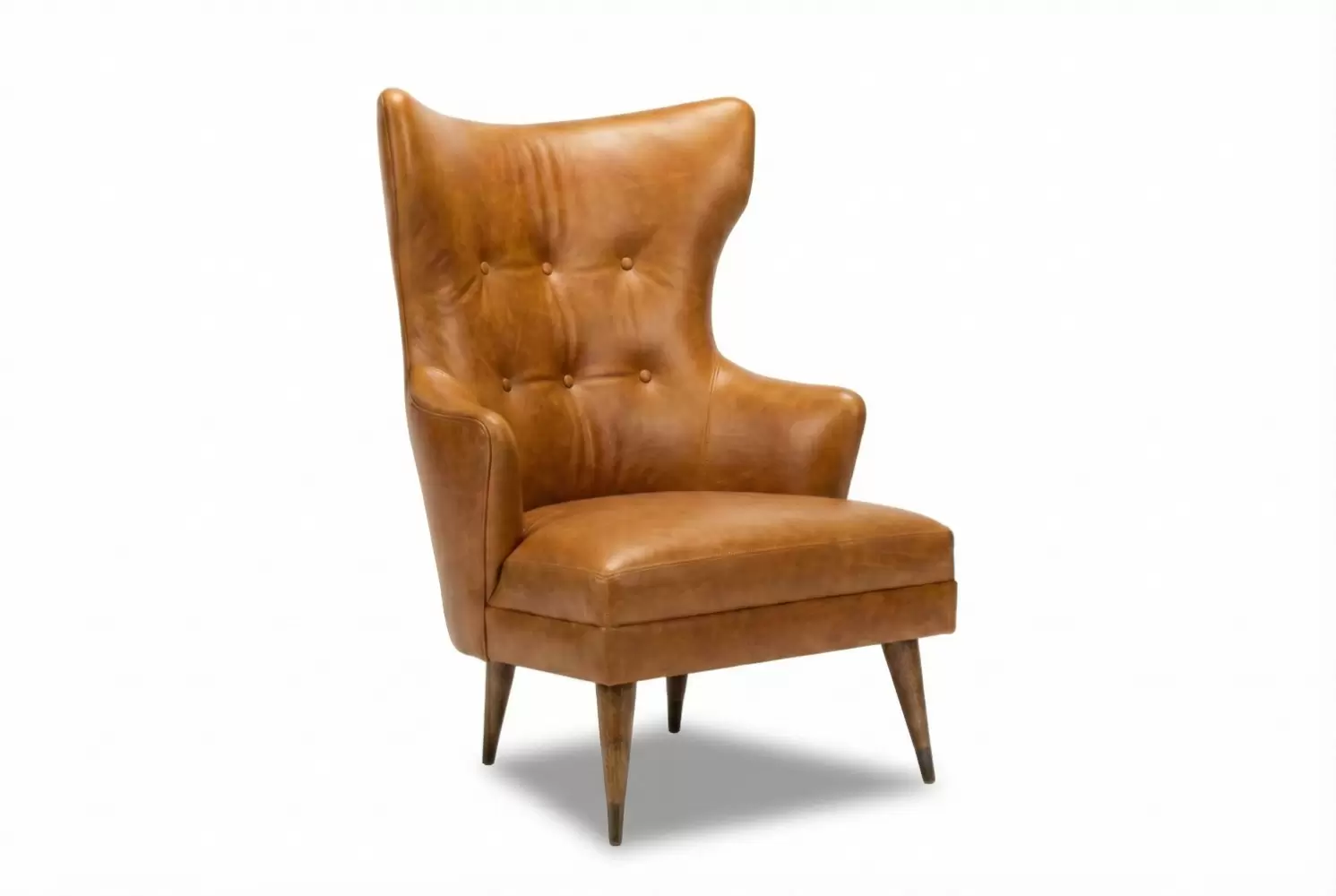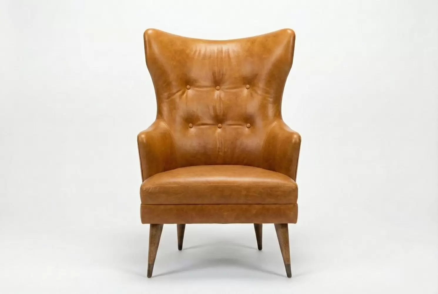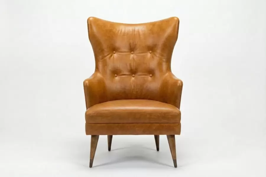The Randolph Chair features a high backrest with winged sides and button tufting for tailored dimension. Its tapered legs and angled stance evoke mid-century sophistication, while the plush seat ensures lasting comfort. All components are customizable.
