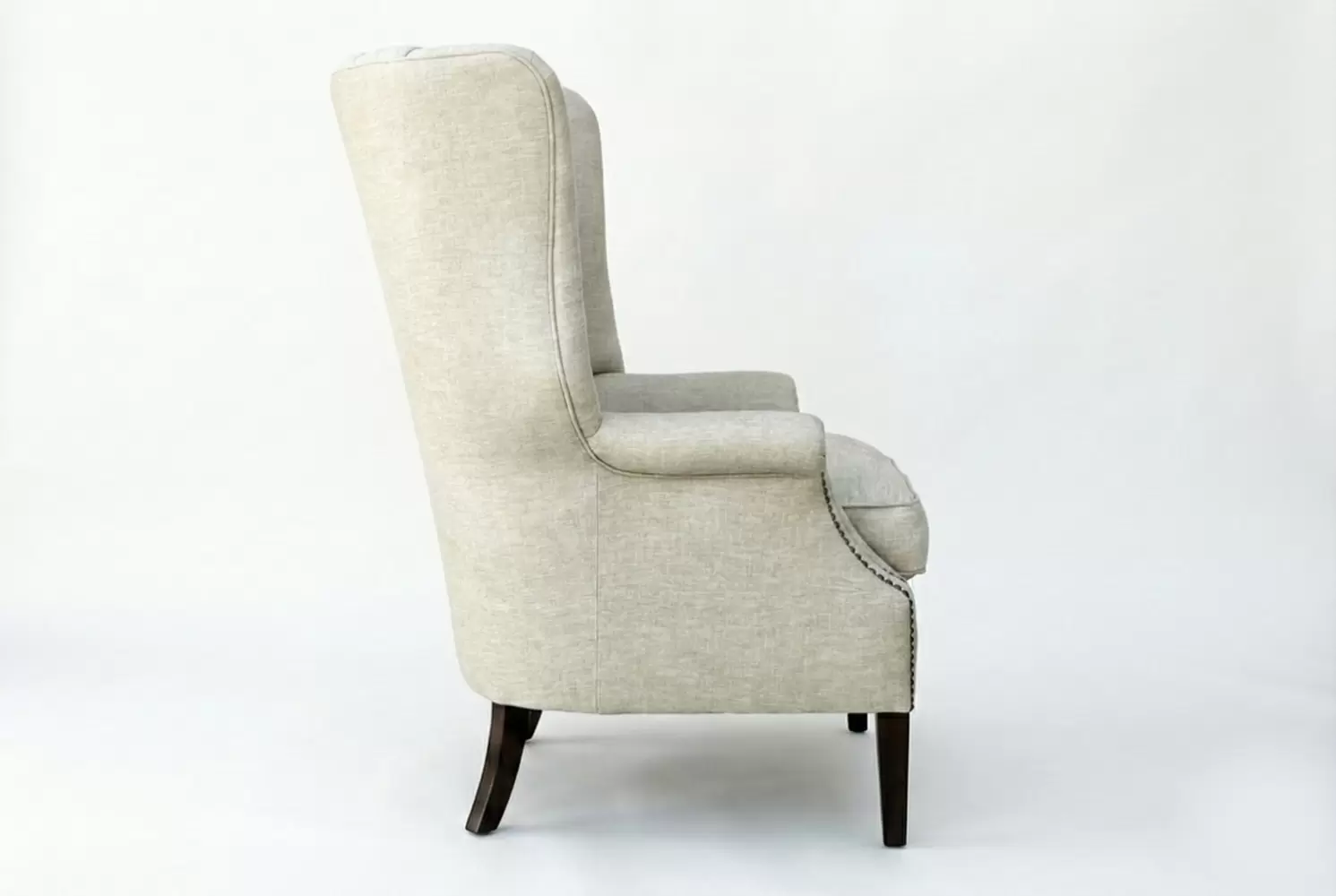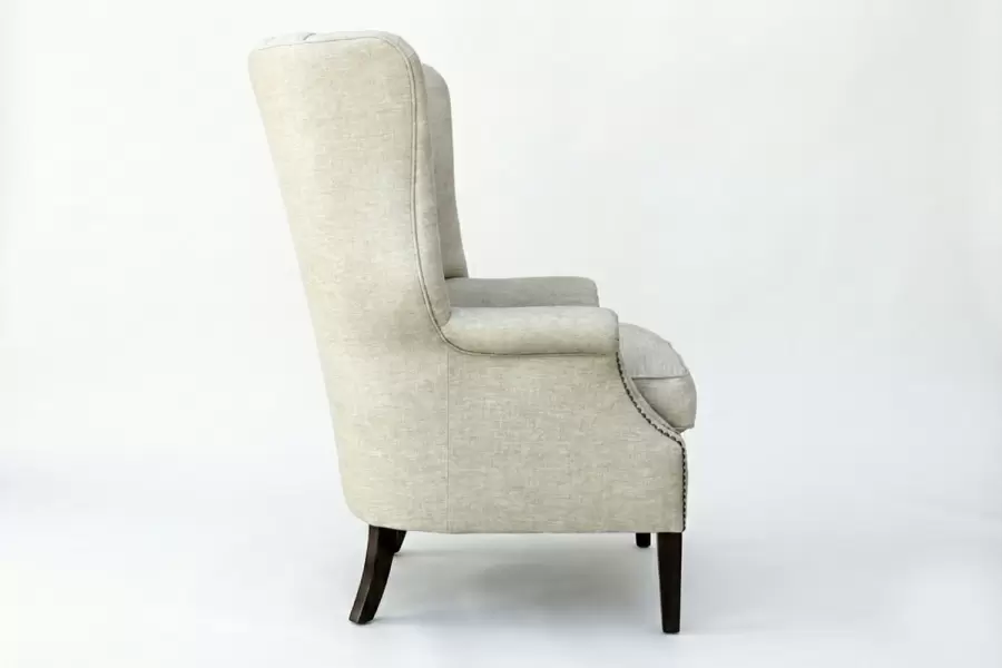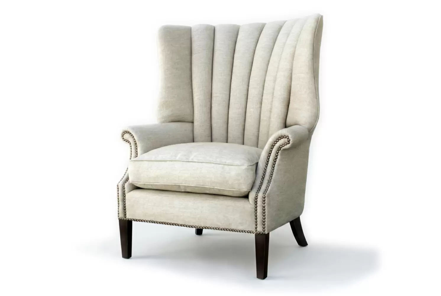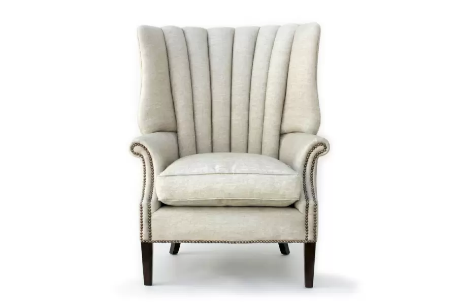 The Rector chair combines tailored elegance with plush comfort. Its high back features vertical channel tufting for a refined silhouette, while rolled arms with nailhead trim add a classic touch. A thick seat cushion and tapered dark wood legs complete the look—perfect for any den, and game room.
