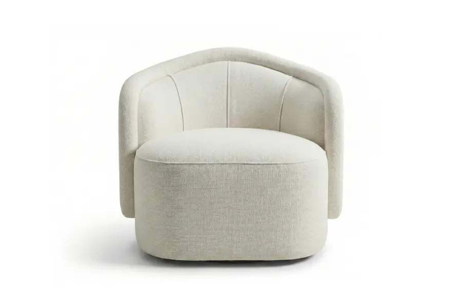 Introducing the Varna chair, a modern club chair defined by inviting curves and a channel-tufted back. Its tailored, floor-skirted silhouette conceals a hidden swivel base, offering effortless movement while maintaining a clean, elegant profile.