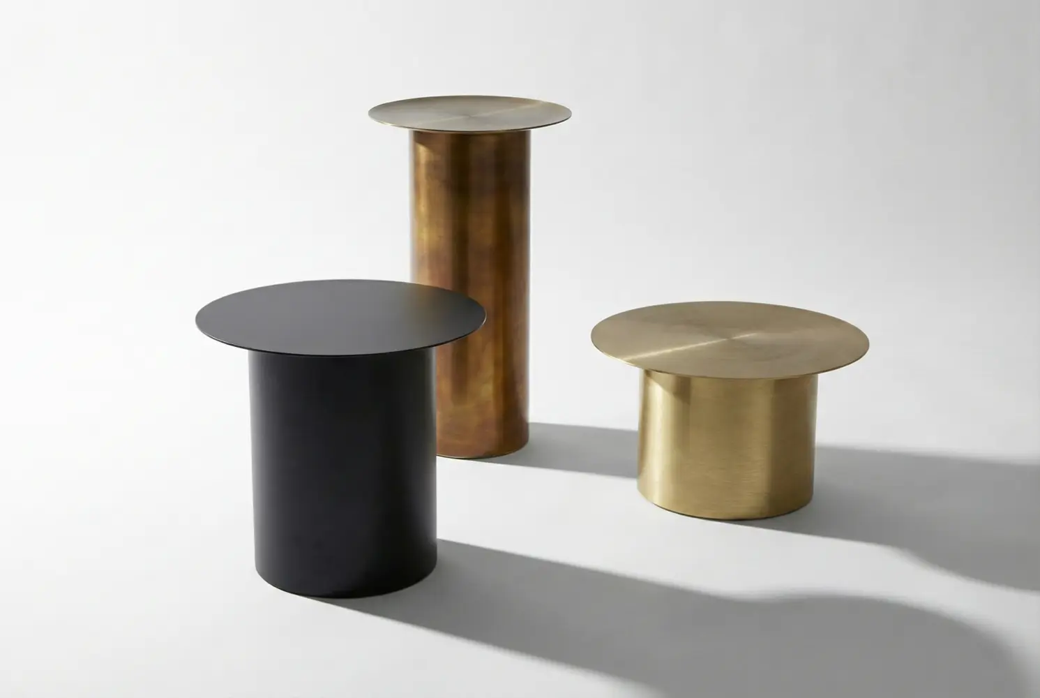 Defined by minimalist cylindrical bases and ultra-thin circular tops, the designs introduce sleek geometric elegance to contemporary interiors. Displayed individually or grouped as a layered centerpiece, the tables offer flexible styling for residential or commercial spaces.