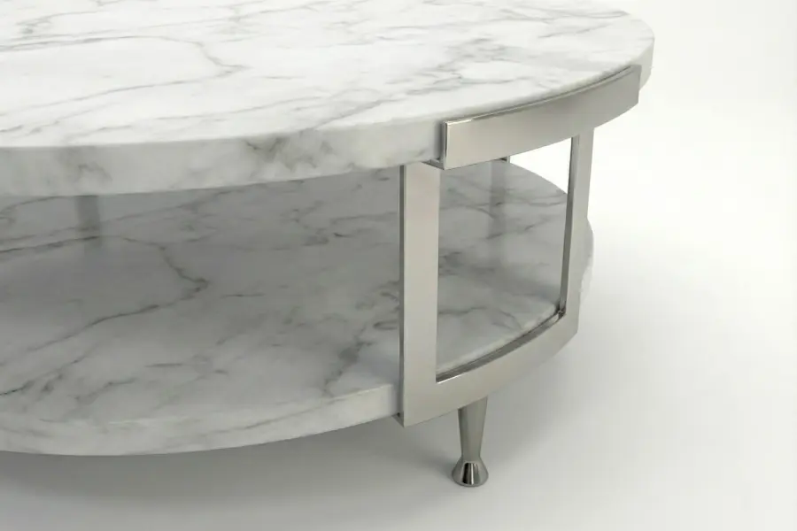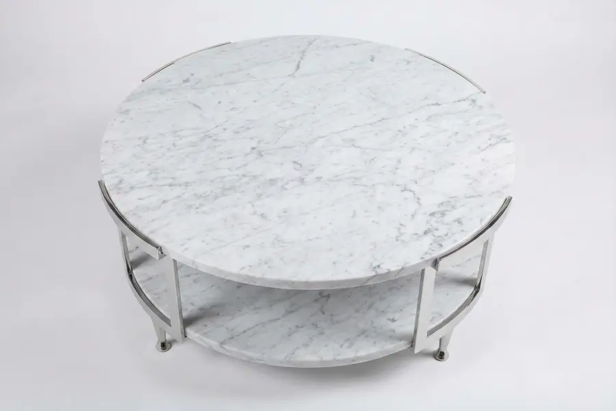 The Luna Piena Coffee Table is a striking two-tiered design crafted from white Carrara marble atop a modern polished nickel base. Its elegant proportions make it ideal for both contemporary and classically styled interiors, serving as a refined centerpiece for living areas.