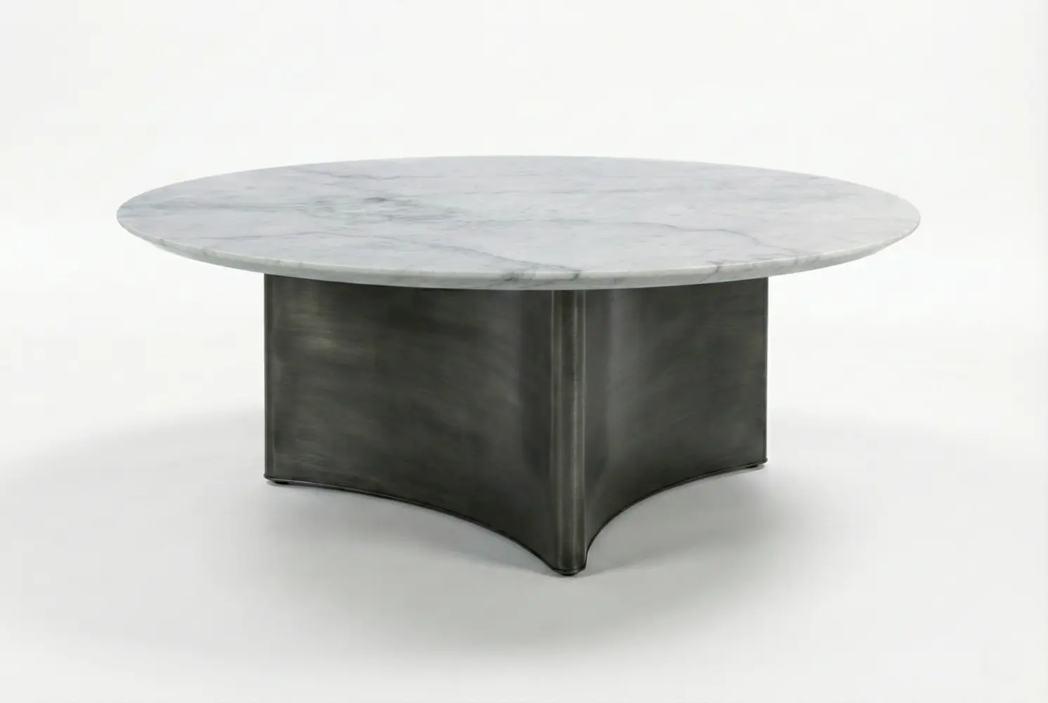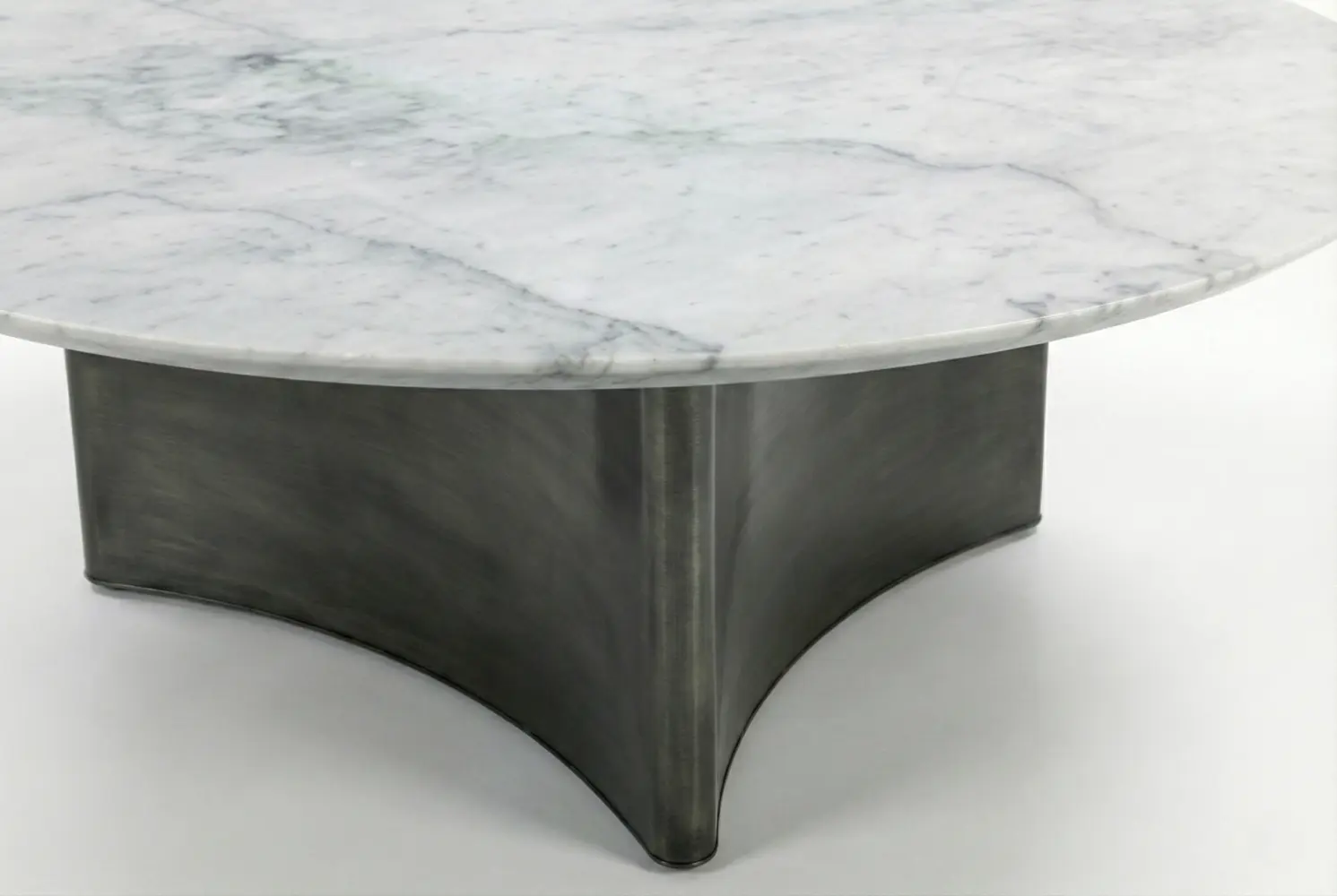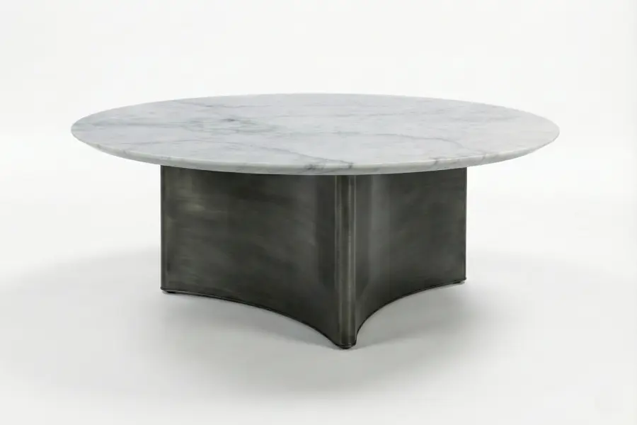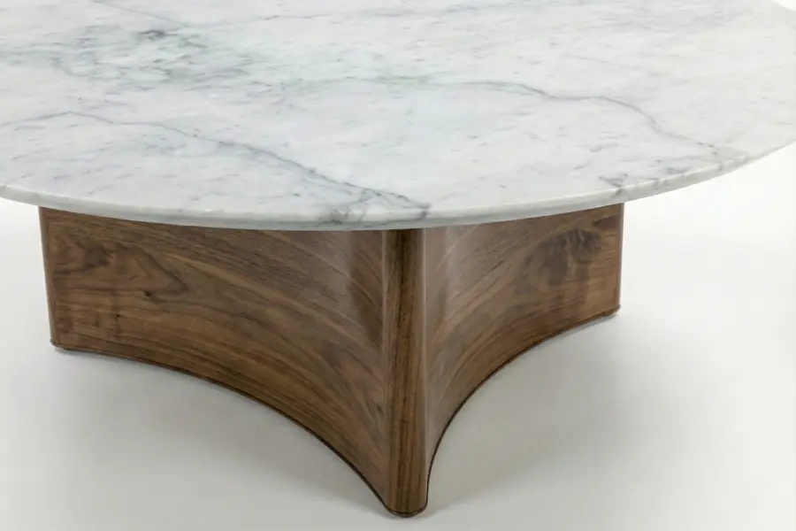 The Quadripoint Cocktail Table is a bespoke statement piece defined by sculptural elegance and architectural balance. A striking marble top with a refined reverse bevel edge creates a subtle floating effect, enhancing its visual lightness. Below, a dramatic four-point sweeping base provides both stability and bold design presence, with concave sides thoughtfully shaped to nest a round ottoman beneath.