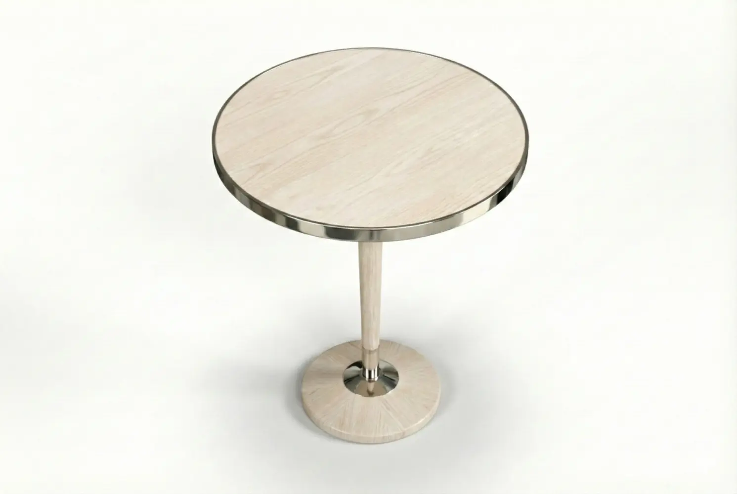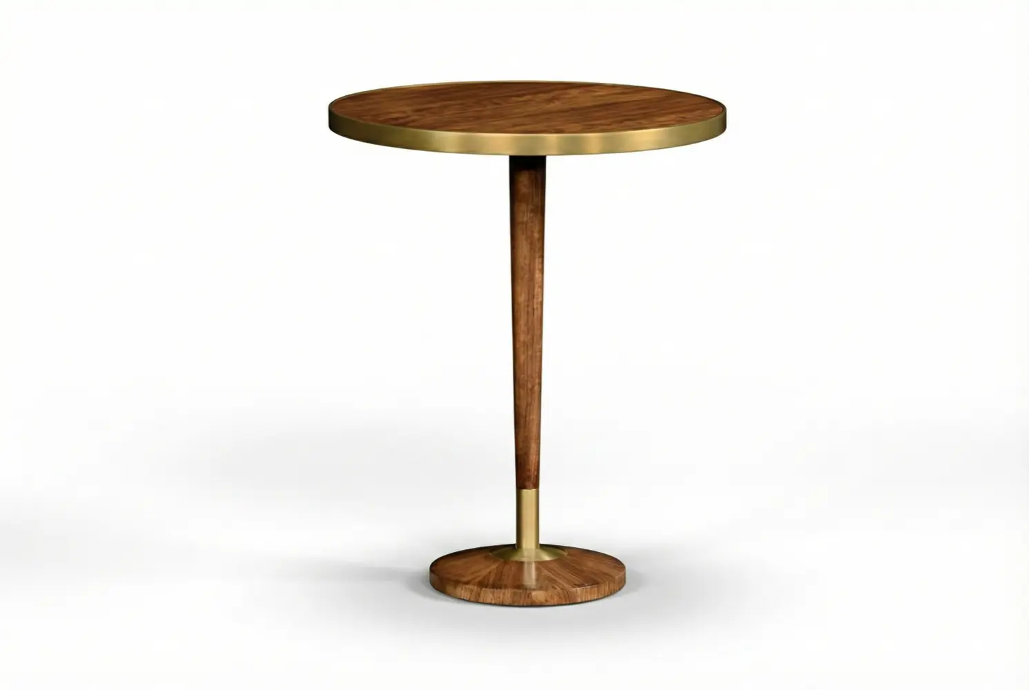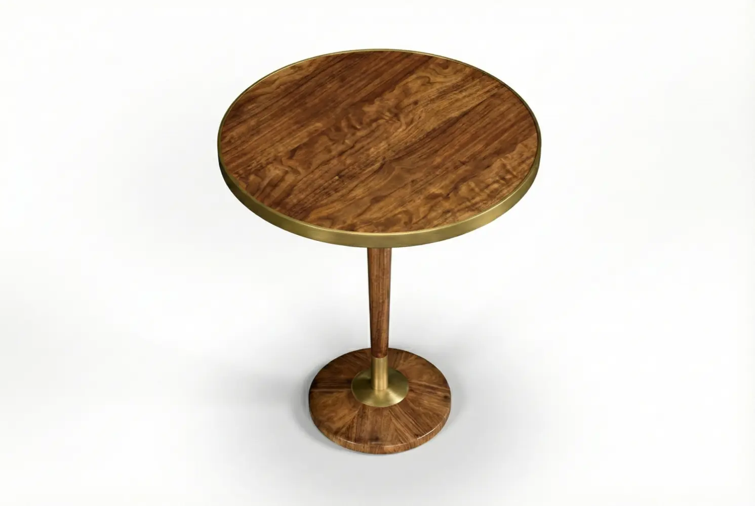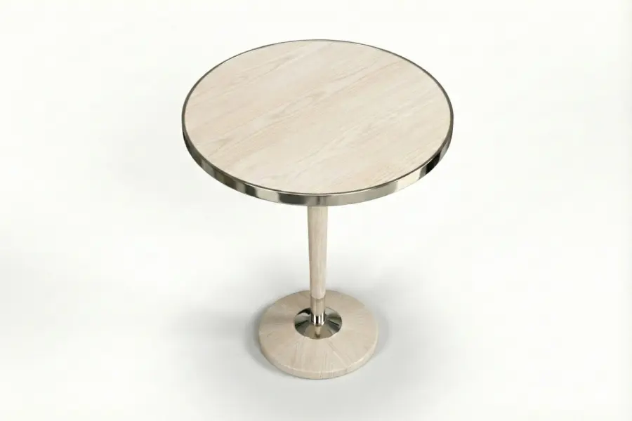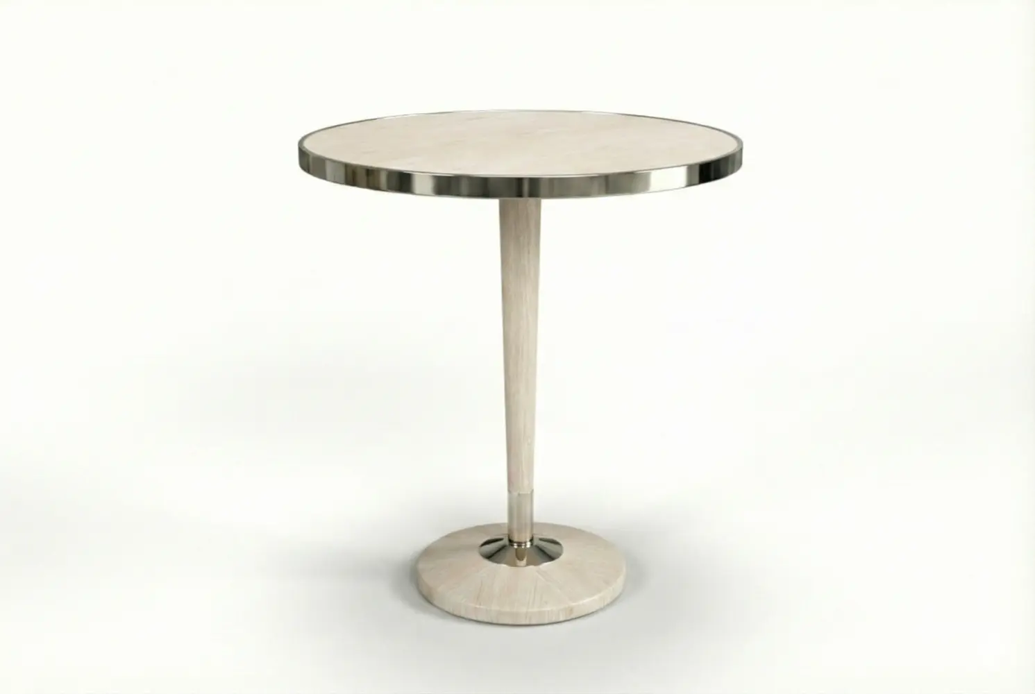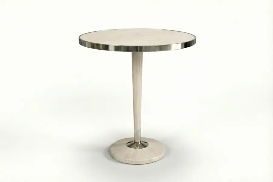 The Stanhope Table pairs sculptural form with refined materiality. Its round top highlights beautifully figured wood, framed by a sophisticated metal band that adds tailored definition. Below, an elegant pedestal base reveals a striking radial grain pattern, accented with subtle metal detailing that enhances its architectural presence.