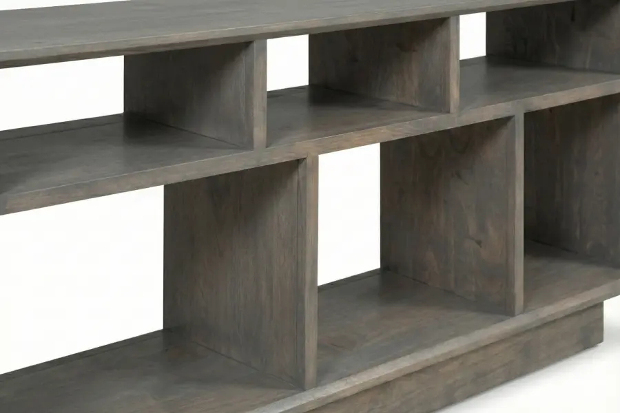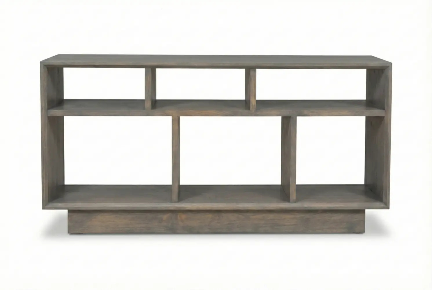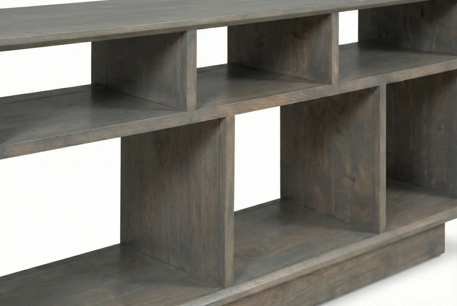 Meet the Argenta Offset Console, a masterclass in modern geometry. Crafted from premium maple in a satin rustic grey finish, its asymmetrical shelving creates a dynamic and sophisticated platform for curated objects, books, or display pieces.