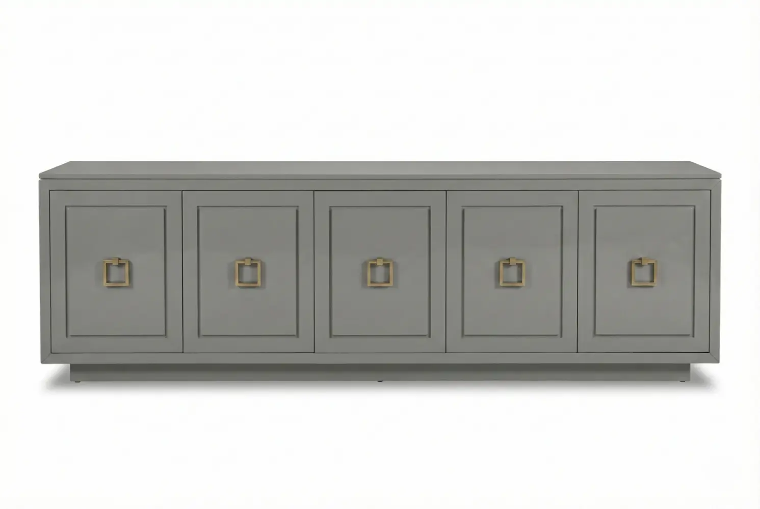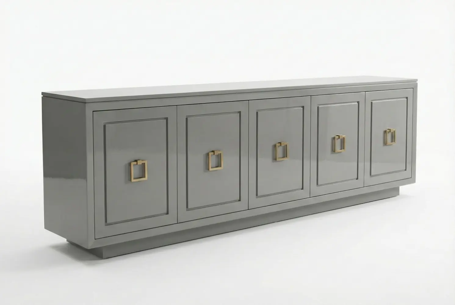 The Credenza Grigia is an elegant five-door casepiece that combines refined aesthetics with versatile storage solutions. Its sophisticated grey high-gloss lacquered finish is complemented by distinctive square brass pulls, creating a polished, contemporary presence.