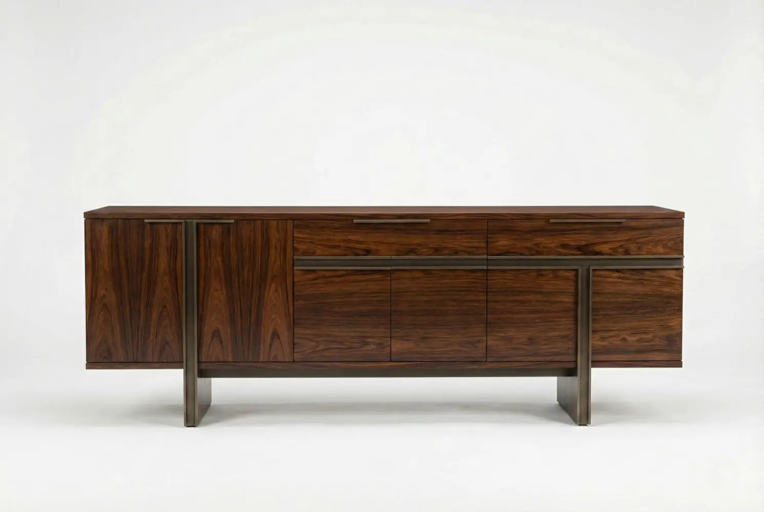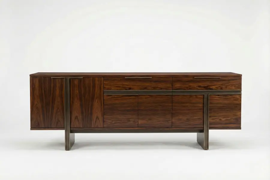 The Interlock Credenza merges architectural bronze framing with book-matched walnut grain, creating a striking focal point for modern and high-end interiors. Signature inset metal details define the transitions between doors and drawers while providing structural integrity.