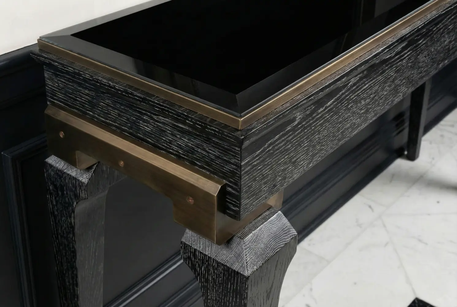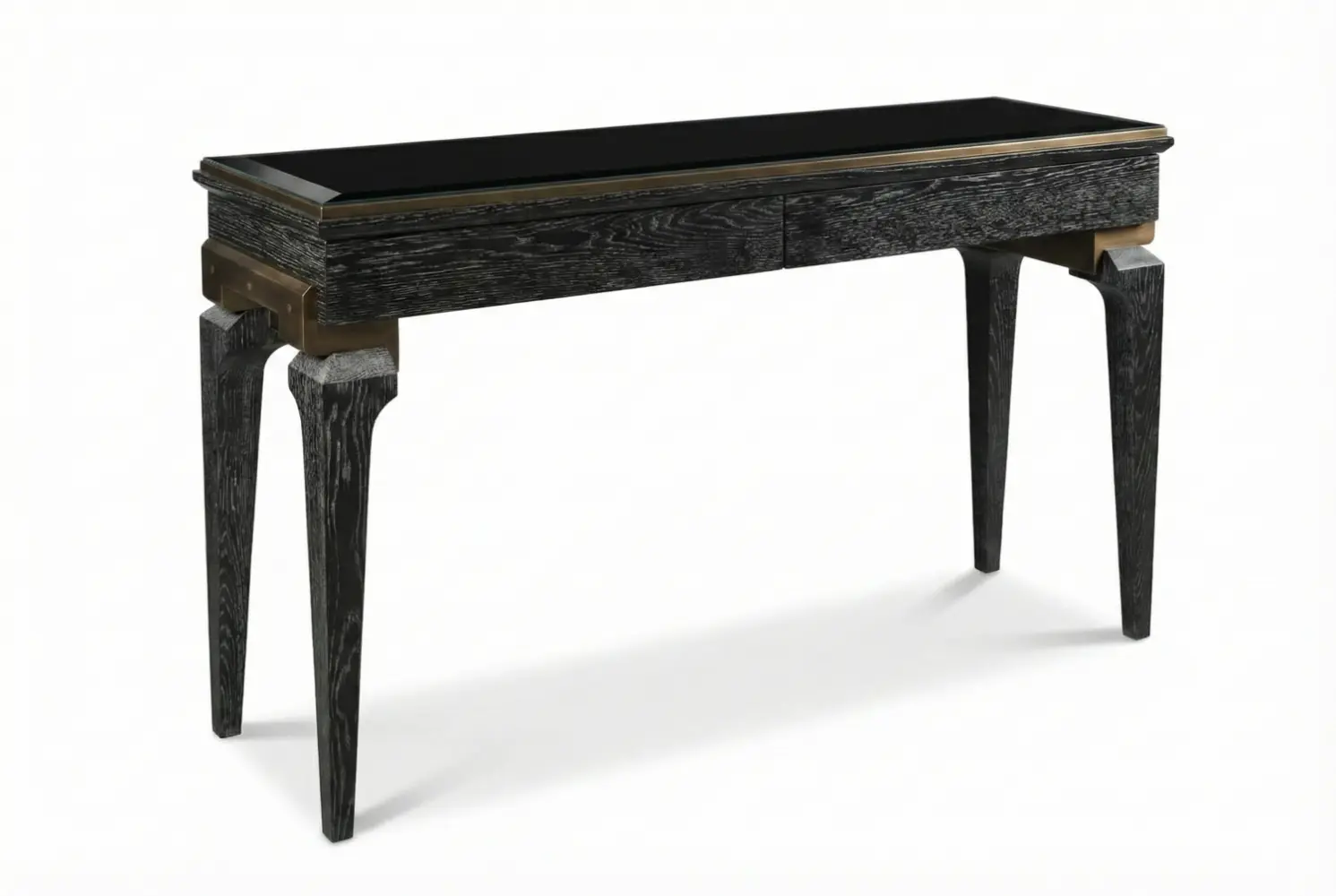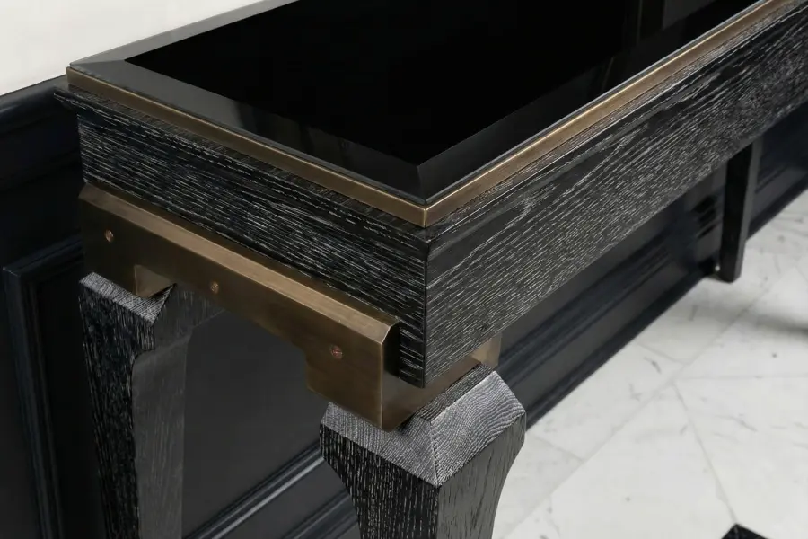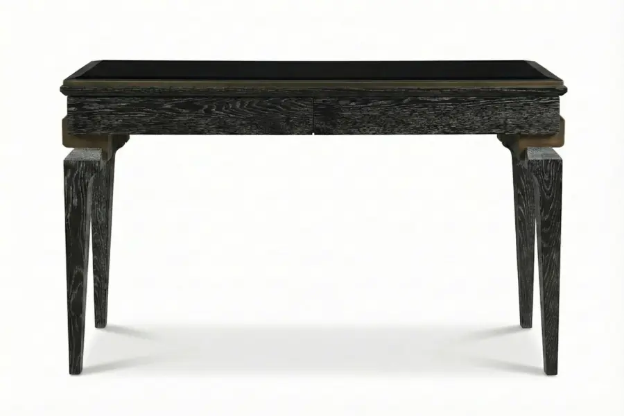 The Michelle Console Table is a masterfully crafted console defined by refined materials and thoughtful proportions. Its solid beveled glass top offers luminous surface presence, while antique bronze details add warmth and architectural character. Dual sleek storage drawers provide refined utility without compromising the table’s elegant silhouette.