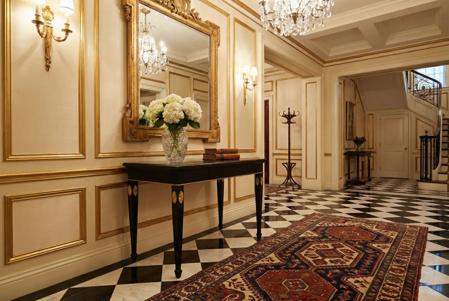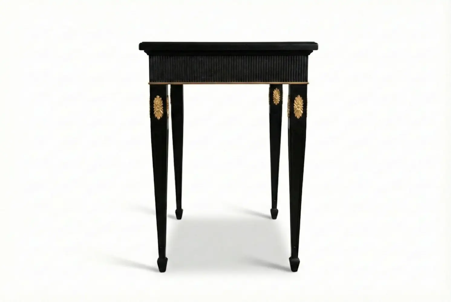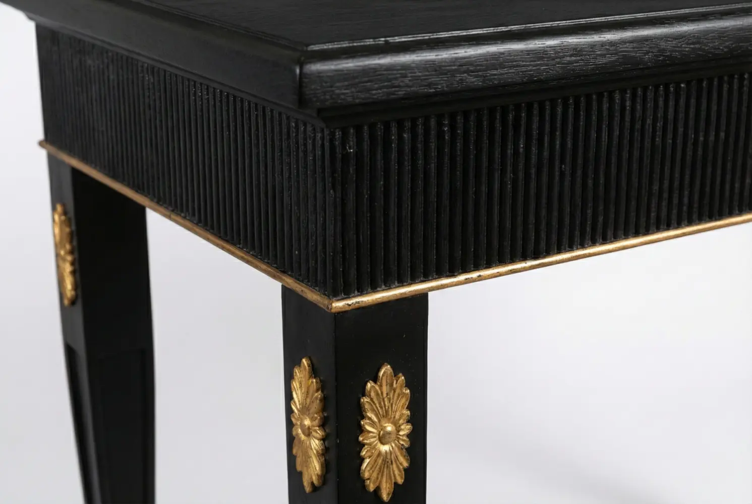The Palais Console Table is a bespoke statement piece inspired by French neoclassical design. Finished in deep ebony with a refined reeded apron, the console is elevated by slender tapered legs adorned with gold-leaf floral medallions and delicate gilt banding.