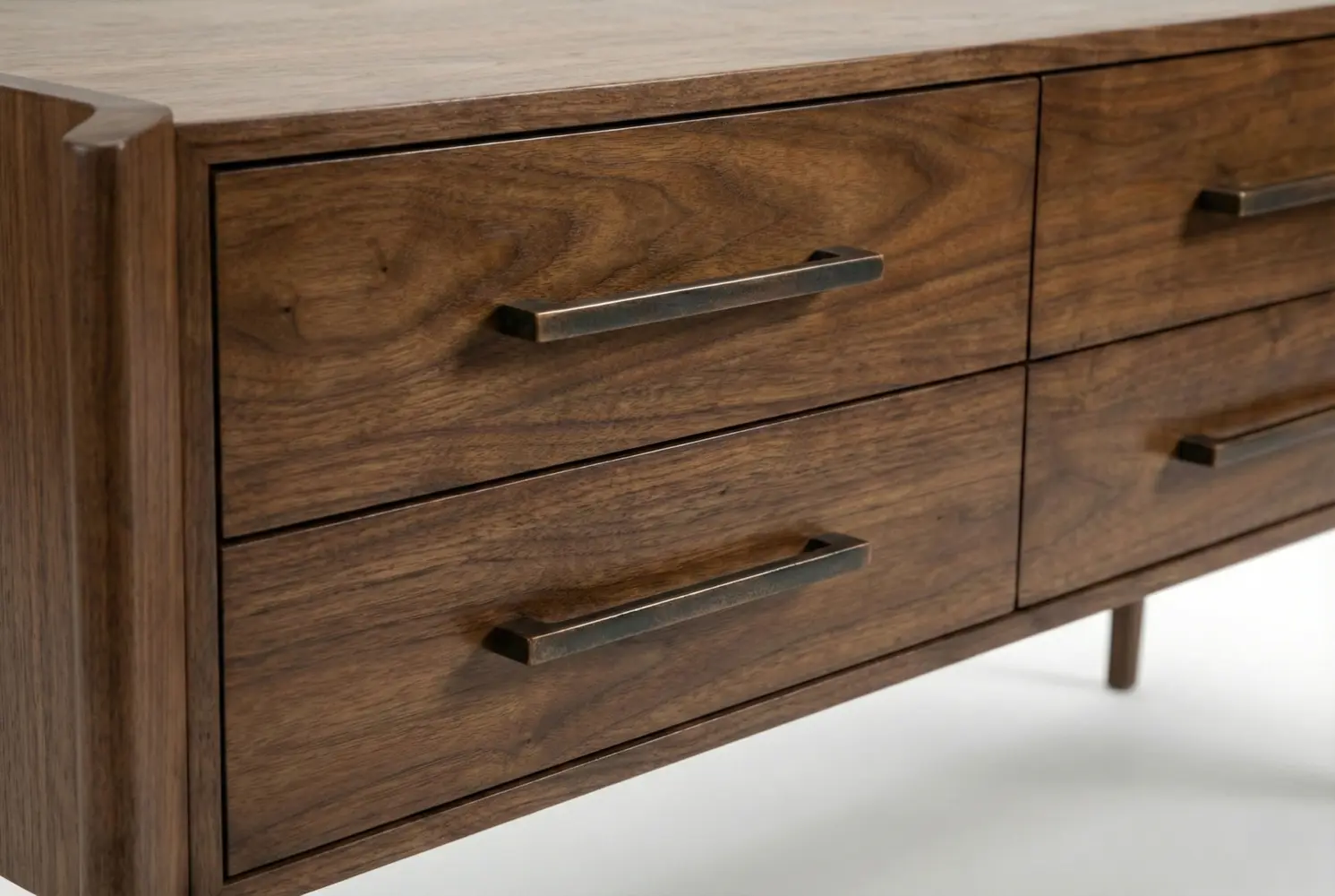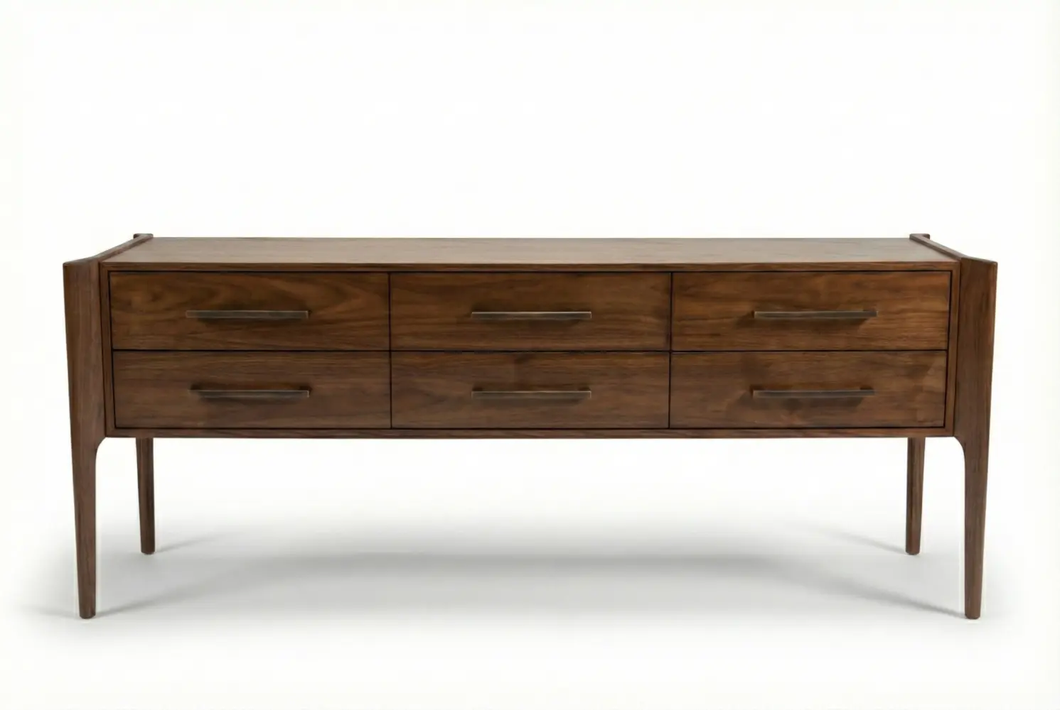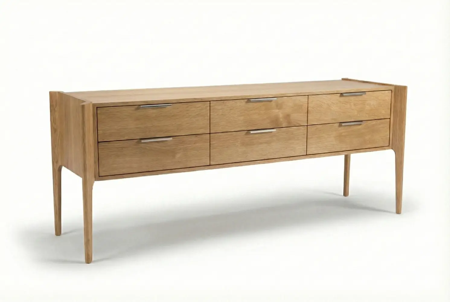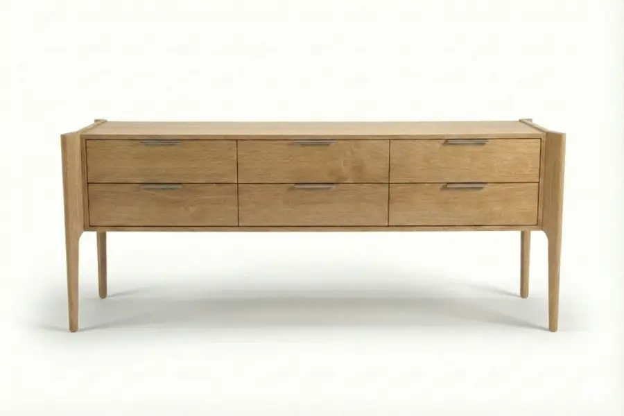 The six-drawer façade features continuous grain matching for a cohesive architectural effect. Customizable hardware and tailored detailing allow this console to be precisely adapted to your interior palette, delivering a harmonious balance of structure, warmth, and refined design.