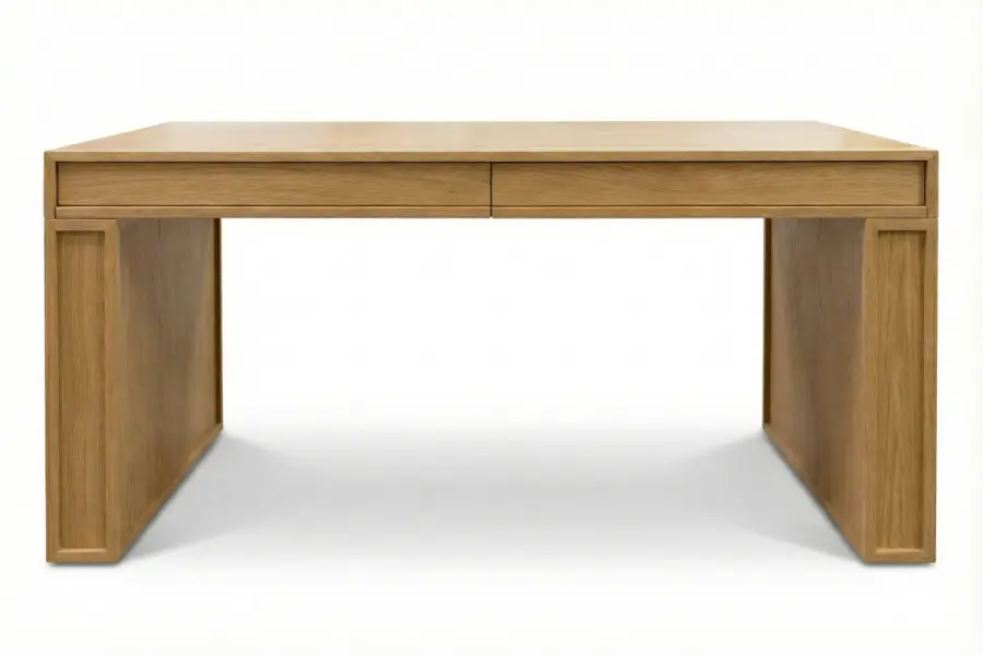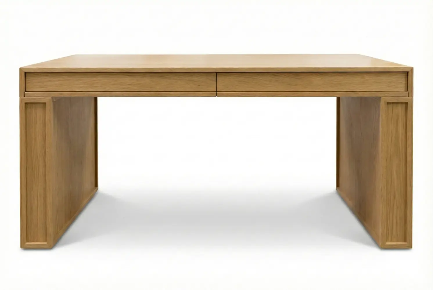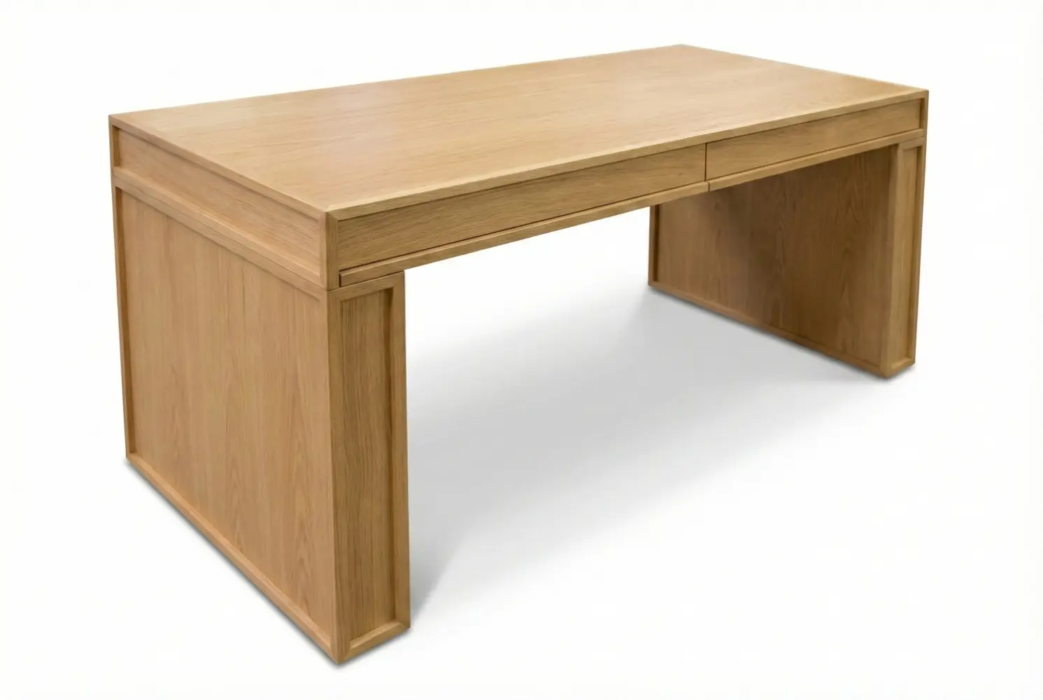 The Union Desk is a custom-crafted executive desk that combines architectural precision with bespoke functionality. Finished in natural oak to highlight the wood’s expressive grain, its design is distinguished by framed recessed side panels and flush-mounted storage drawers that maintain a clean, streamlined profile.