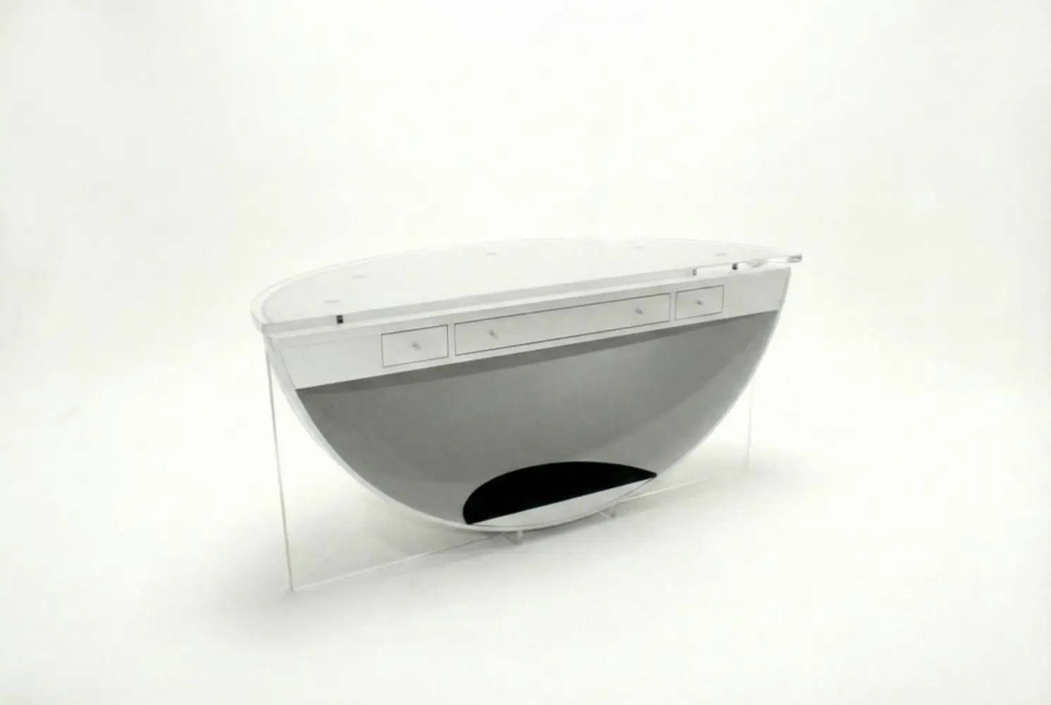 Supported by clear Lucite legs, its distinctive form creates a visually light presence while maintaining practical functionality. Three integrated storage drawers provide organized workspace solutions within its refined silhouette.