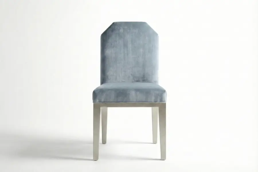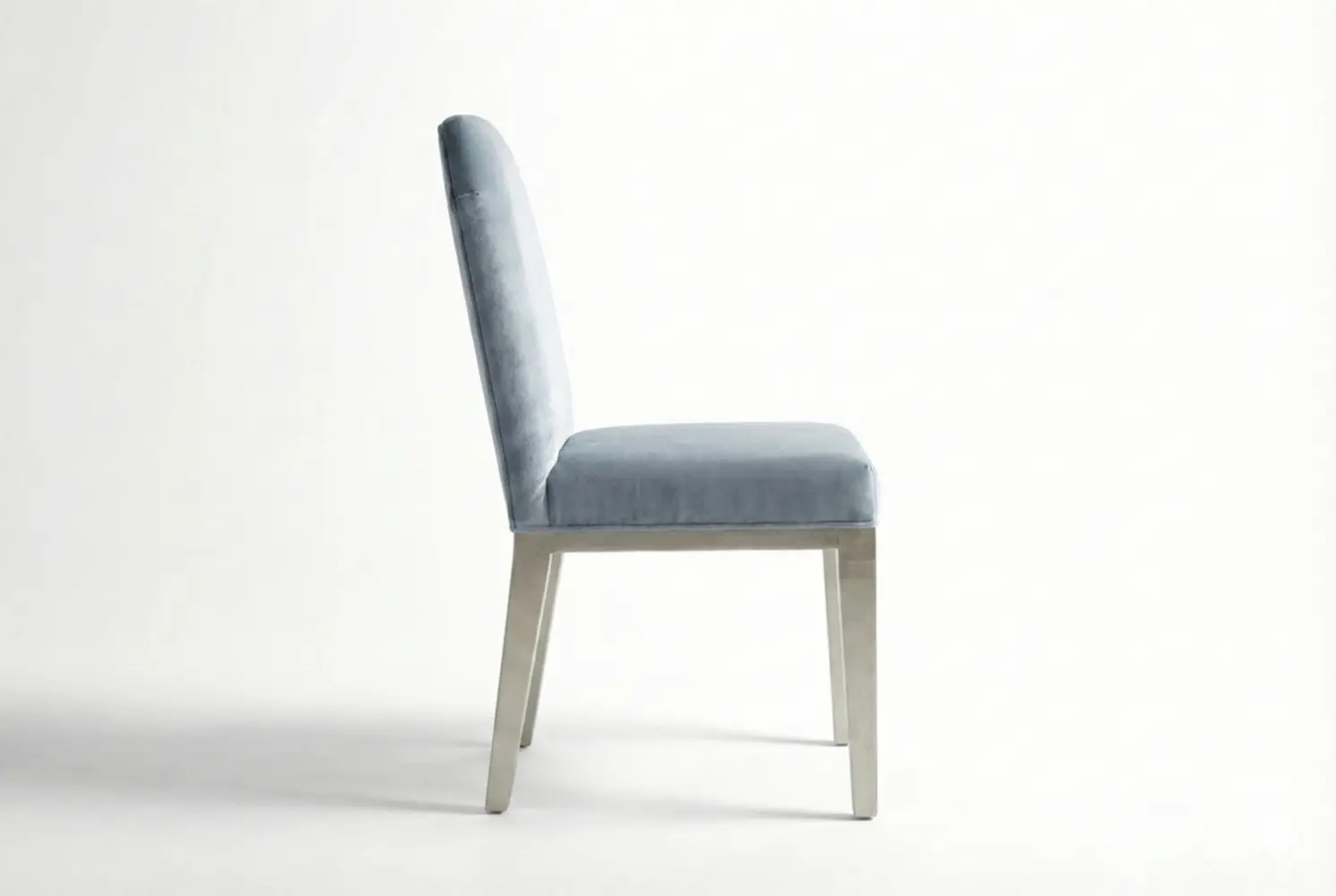 The Lumière Dining Chair brings subtle French-inspired glamour to any dining space. Its defining clipped-corner backrest, upholstered in plush velvet, provides both comfort and sophisticated style. Sleek, tapered wooden legs finished in silver leaf add a refined metallic accent, grounding the elegant silhouette.