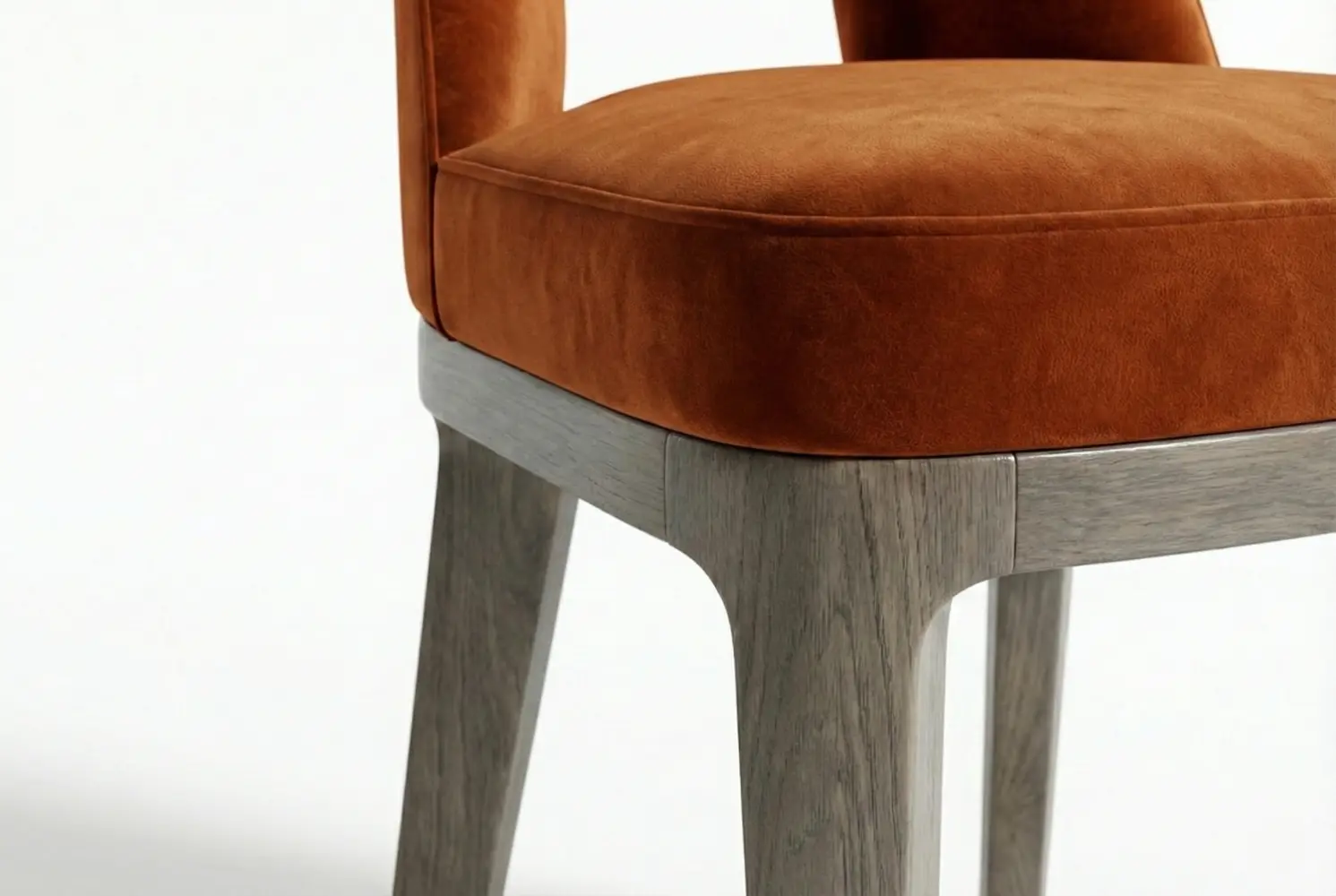 Pictured in rich burnt orange velvet atop a grey-washed wood base, this fully bespoke chair can be tailored to your specifications with a wide selection of premium hardwood finishes and designer fabrics or COM options, ensuring a seamless integration into your interior while highlighting its distinctive silhouette.