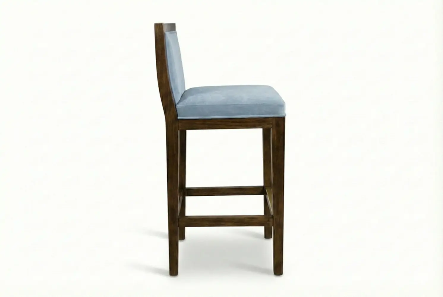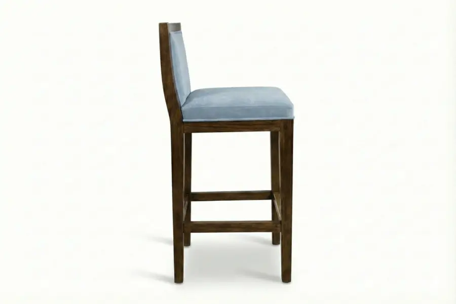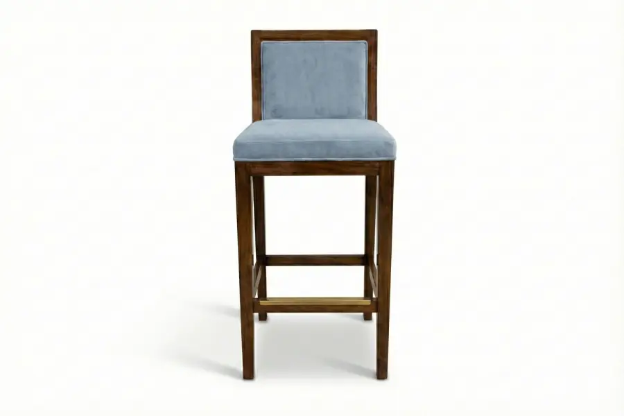The Nassau Barstool exemplifies contemporary elegance with a geometric wooden frame that immediately draws the eye. Its upholstered seat and back cushions, finished with precise welt detailing, provide both comfort and visual refinement.