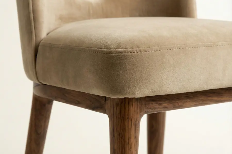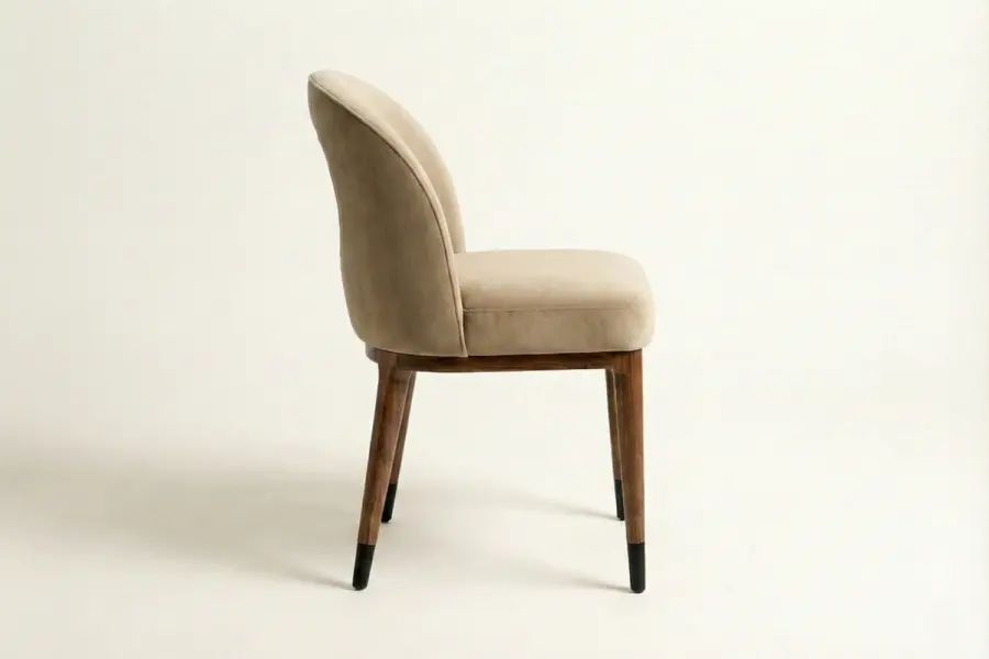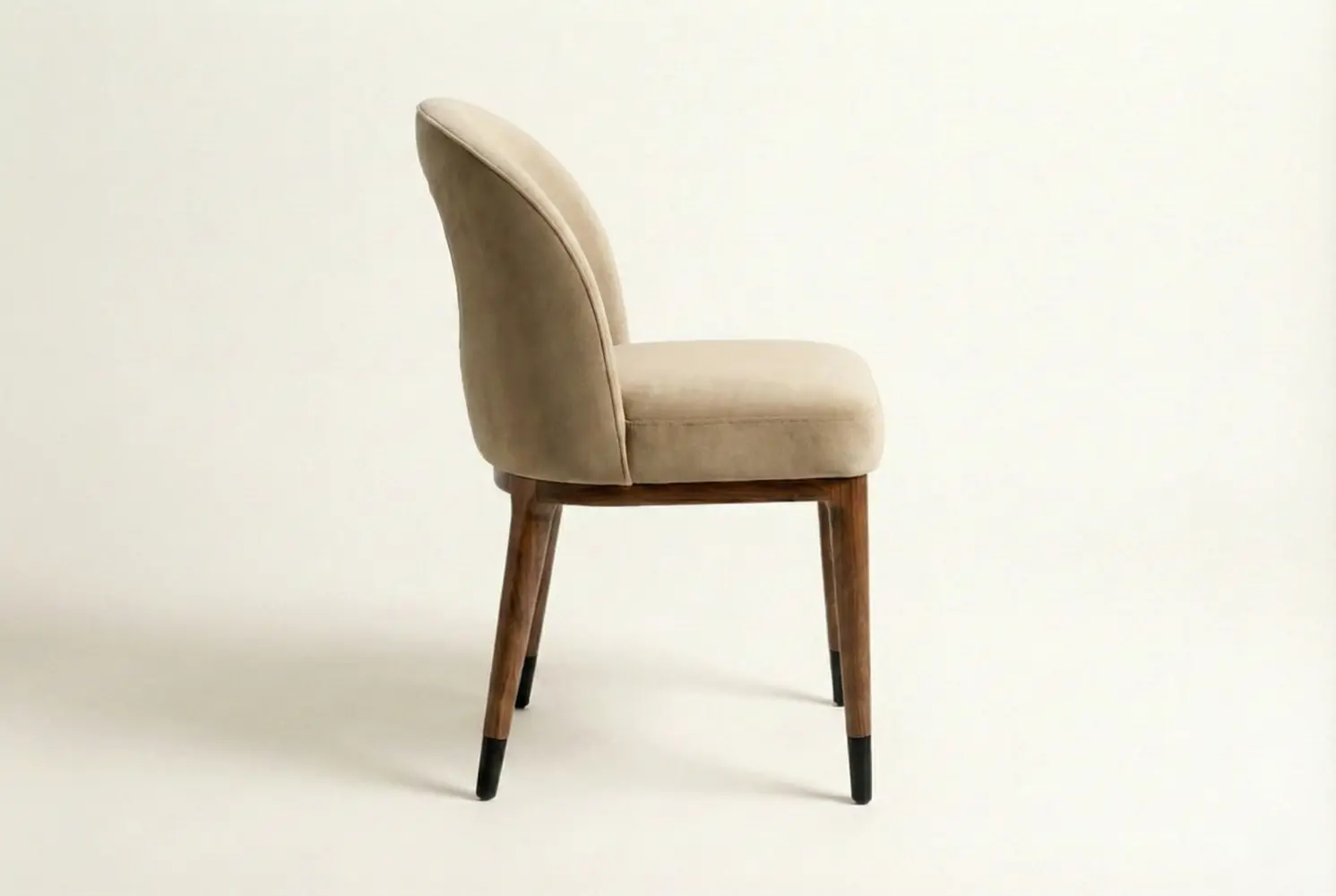 The Novara Dining Chair combines contemporary structure with Italian-inspired refinement. A distinctive circular cut-out within the gracefully curved backrest creates visual interest while supporting ergonomic comfort. The tailored seat, shown in taupe velvet, is balanced by tapered hardwood legs finished with contrasting dark metal sabots for a refined architectural detail.