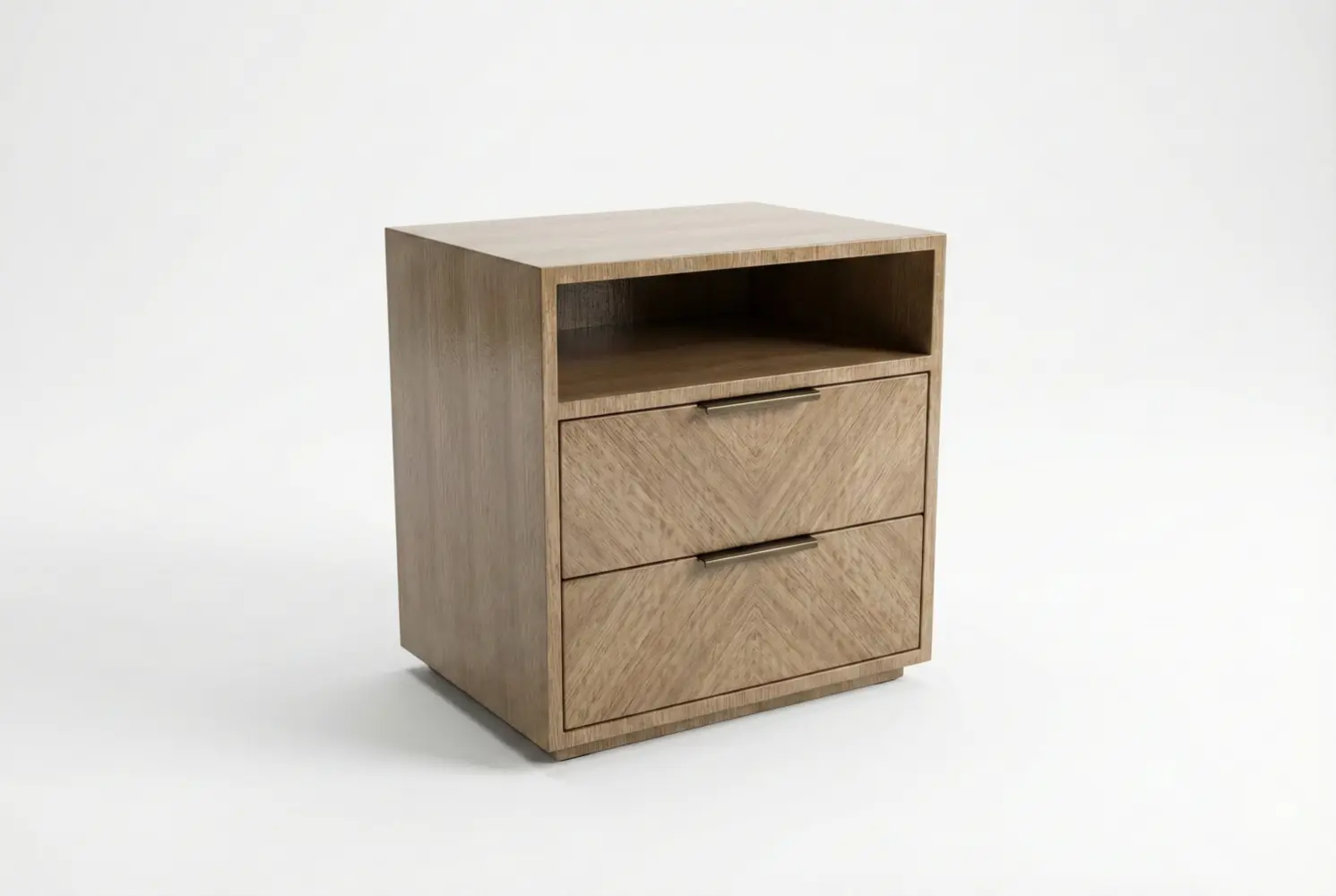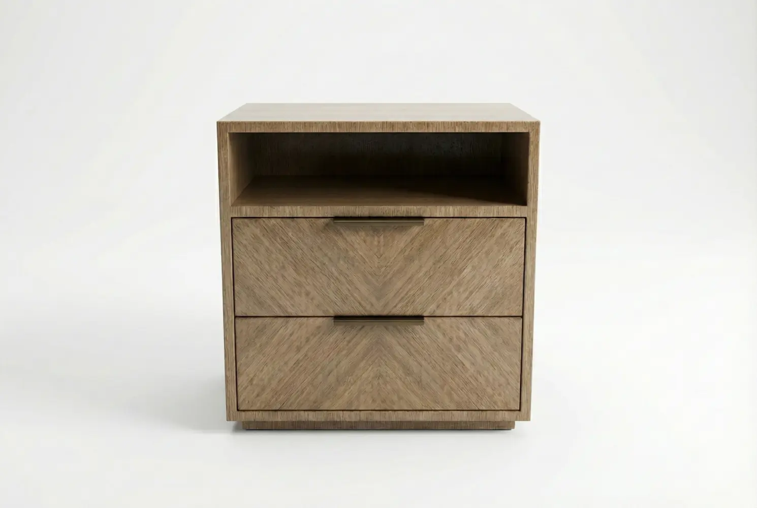 The Charlotte Nightstand exemplifies modern luxury through refined detailing and masterful craftsmanship. Its striking chevron wood veneer brings depth and visual movement to the two spacious lower drawers, while an open upper shelf offers both balance and everyday accessibility. The composition is thoughtfully designed to deliver both elegance and practical function within a clean, architectural silhouette.
