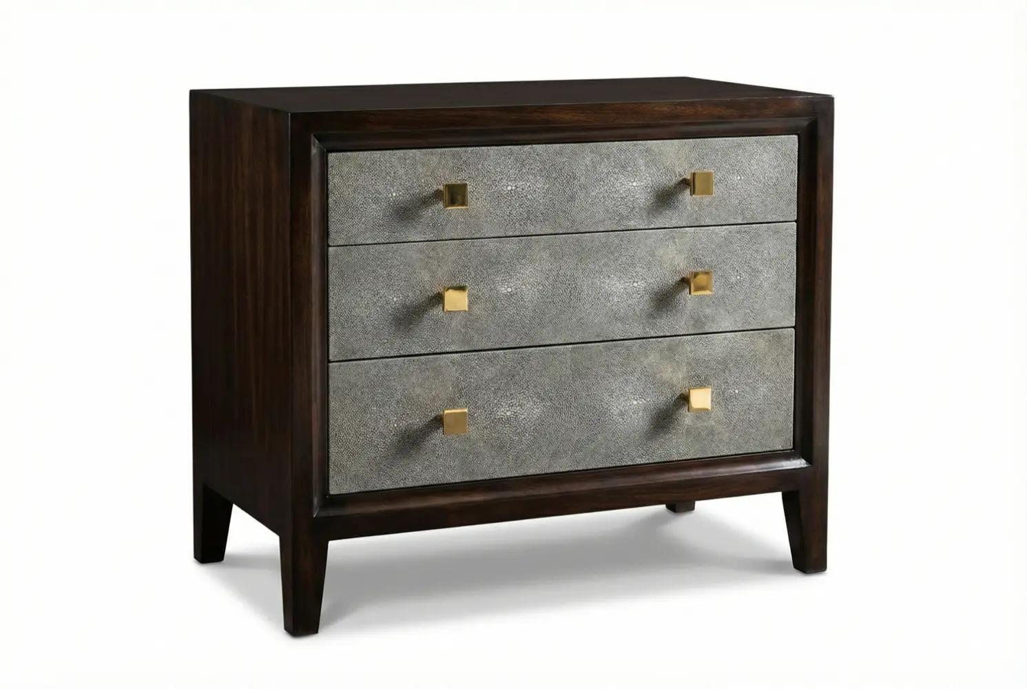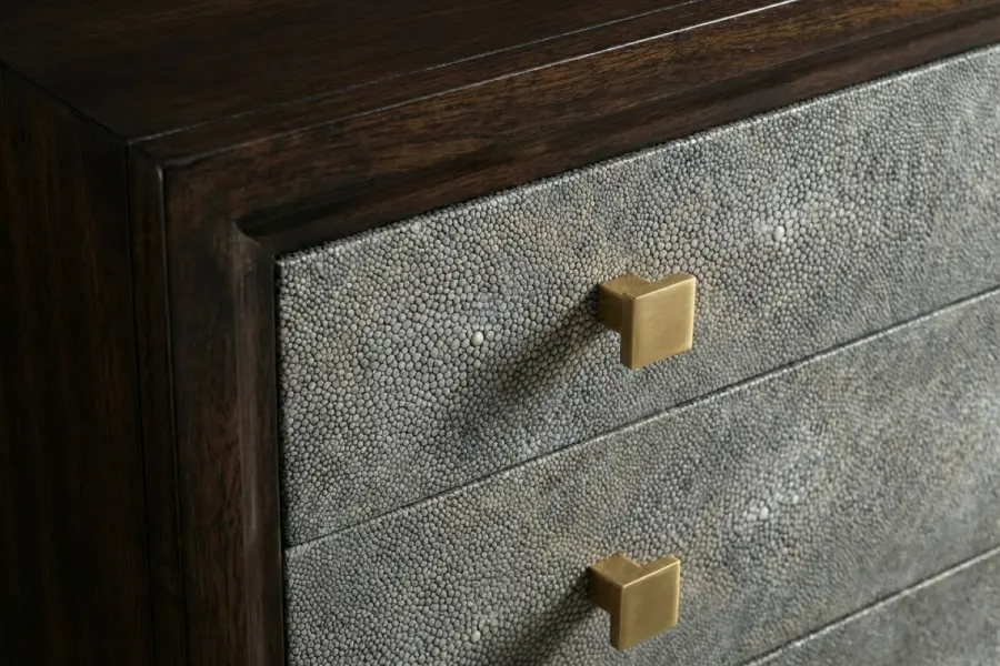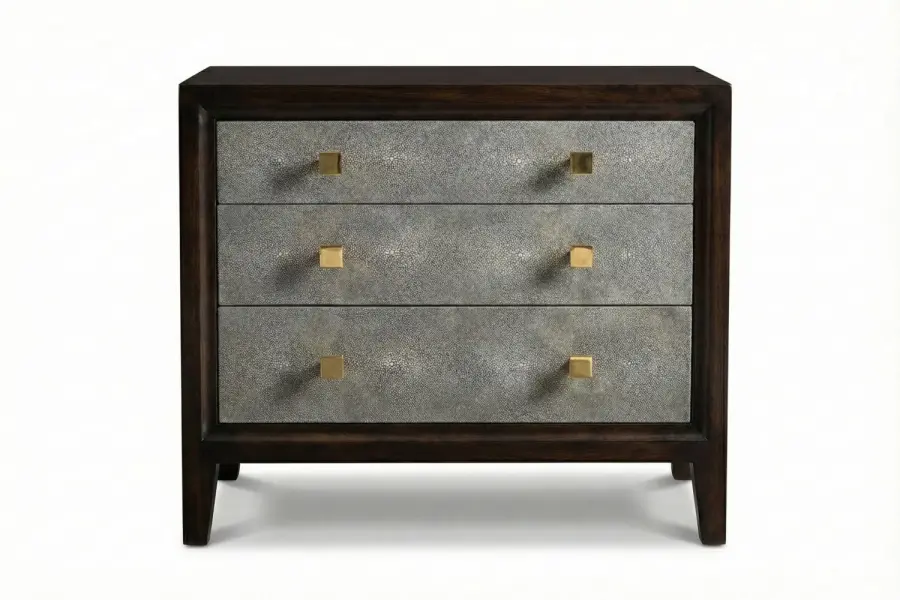 The Ellingron Chest of Drawers is an elegant bedside casepiece defined by refined materials and tailored proportions. Its embossed leather drawer fronts introduce subtle texture, while the warm walnut wood frame and chic tapered legs create a composed silhouette that complements modern and transitional bedroom interiors.