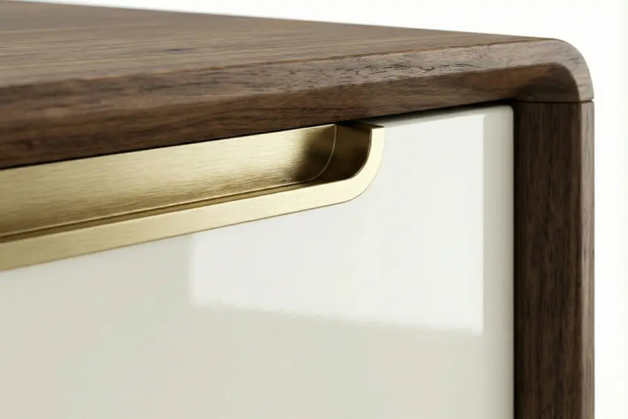 Integrated brass pull details form a continuous horizontal accent, enhancing the night table’s clean architectural lines.