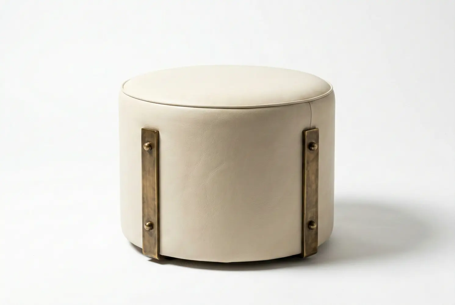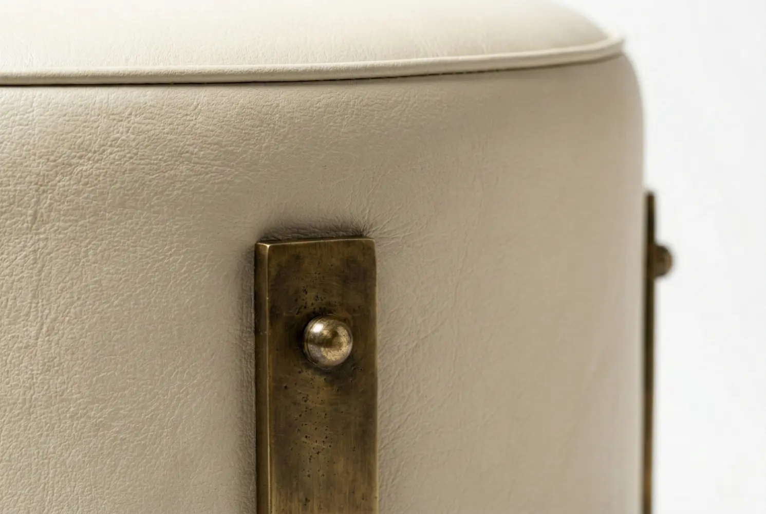 The Aurelius Ottoman pairs supple ivory leather with distinctive burnished brass strapping, creating a striking balance of texture and metal detailing. Its clean form and architectural accents make it a sophisticated addition to living rooms, lounges, or refined seating areas, where material contrast becomes a defining design element.