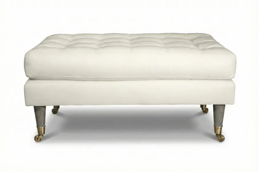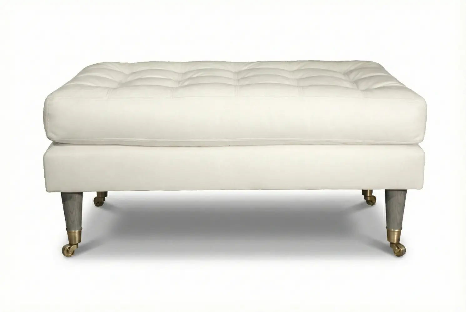 The Bawery Square Tufted Ottoman embodies timeless luxury through its deep biscuit tufting and refined square profile. Elegant tapered wood legs, finished with brass casters, provide both visual distinction and practical mobility, making the piece suitable for living rooms, dressing areas, or sophisticated seating arrangements.