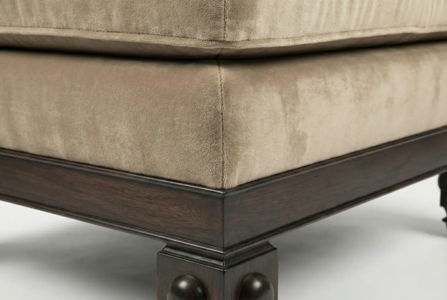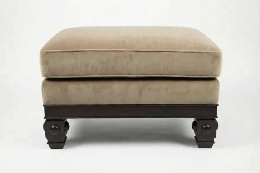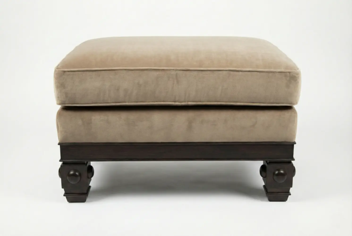 The Bethune Ottoman highlights architectural craftsmanship through its distinctive carved wood base, detailed with spherical accents that emphasize structural artistry and dimensional form. The sculpted foundation creates a strong visual presence, while the upholstered top introduces balance and comfort, making it a refined addition to living rooms, lounges, or statement interiors.