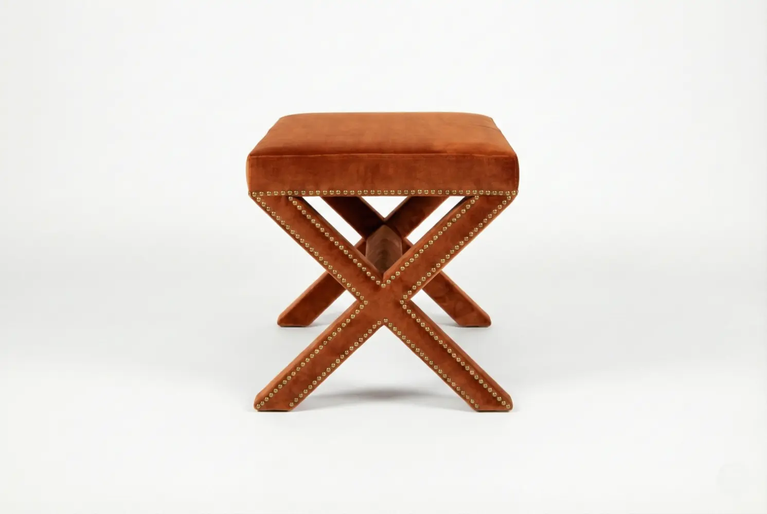 The Elmwood Ottoman Stool delivers a bold architectural presence through its fully upholstered X-frame silhouette, enhanced by meticulous nailhead trim. The intersecting base design creates sculptural depth, while the tailored seat ensures comfort and refined visual balance. Ideal as an accent stool, vanity seat, or decorative element within living spaces, the Elmwood combines structure and softness in a distinctive modern form.