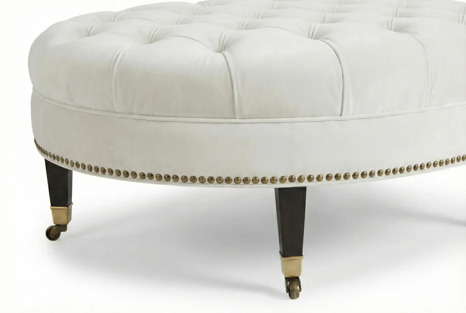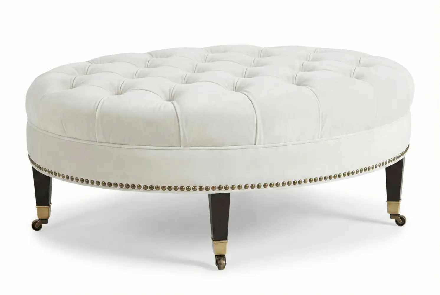 The English Oval Ottoman embodies classic luxury through its deep diamond tufting, refined oval silhouette, and sophisticated nailhead trim. The elongated shape offers a graceful presence in living rooms, bedrooms, or formal seating areas, while the tailored detailing enhances both texture and visual depth. Elegant tapered legs provide a balanced foundation, contributing to its timeless character.