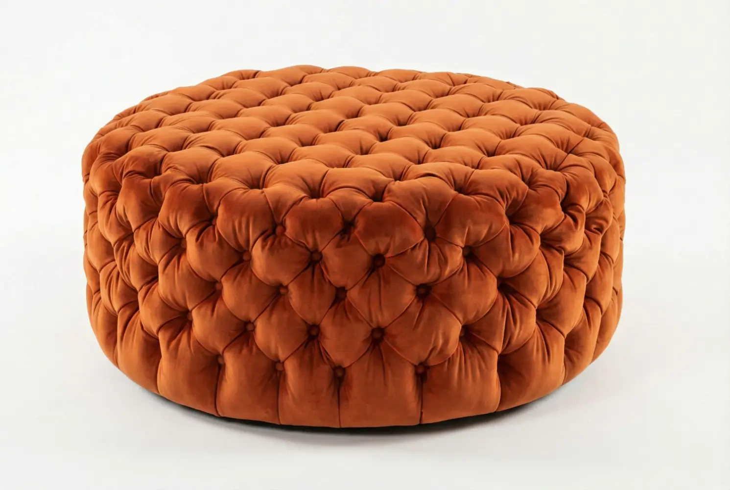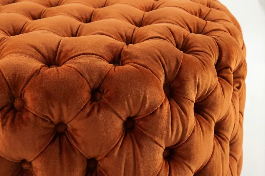 The Houston Round Ottoman serves as a striking centerpiece, defined by its expansive circular silhouette and luxurious all-over deep button tufting. The continuous tufted surface creates rich texture and dimensional depth, making it ideal for anchoring large living rooms, lounges, or sophisticated seating arrangements. Its generous round form functions beautifully as extra seating or as a plush alternative to a traditional coffee table.