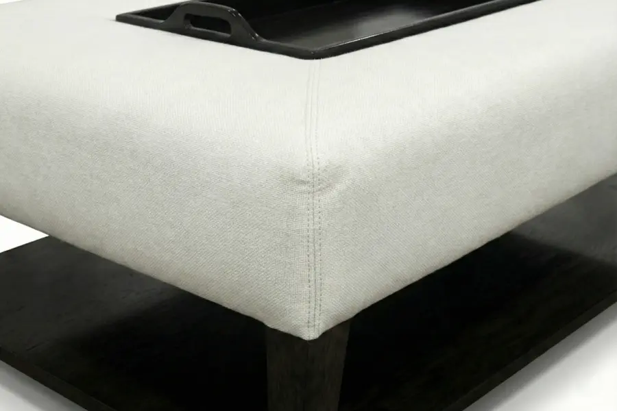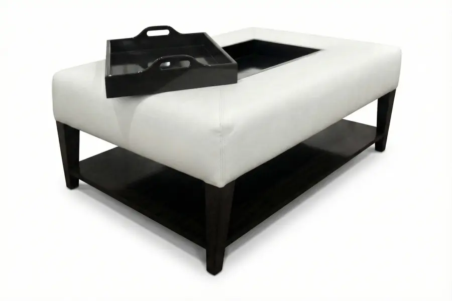 The Jewel Ottoman Table combines refined upholstery with intelligent functionality, creating a versatile centerpiece for contemporary living spaces. A sleek cushioned top is paired with an integrated, removable serving tray and a convenient lower display shelf, offering both surface utility and open storage within a single elegant design. Its balanced proportions make it ideal for entertaining, relaxed living, or multi-functional interiors where style and practicality are equally important.