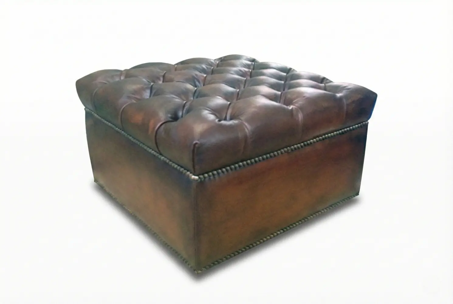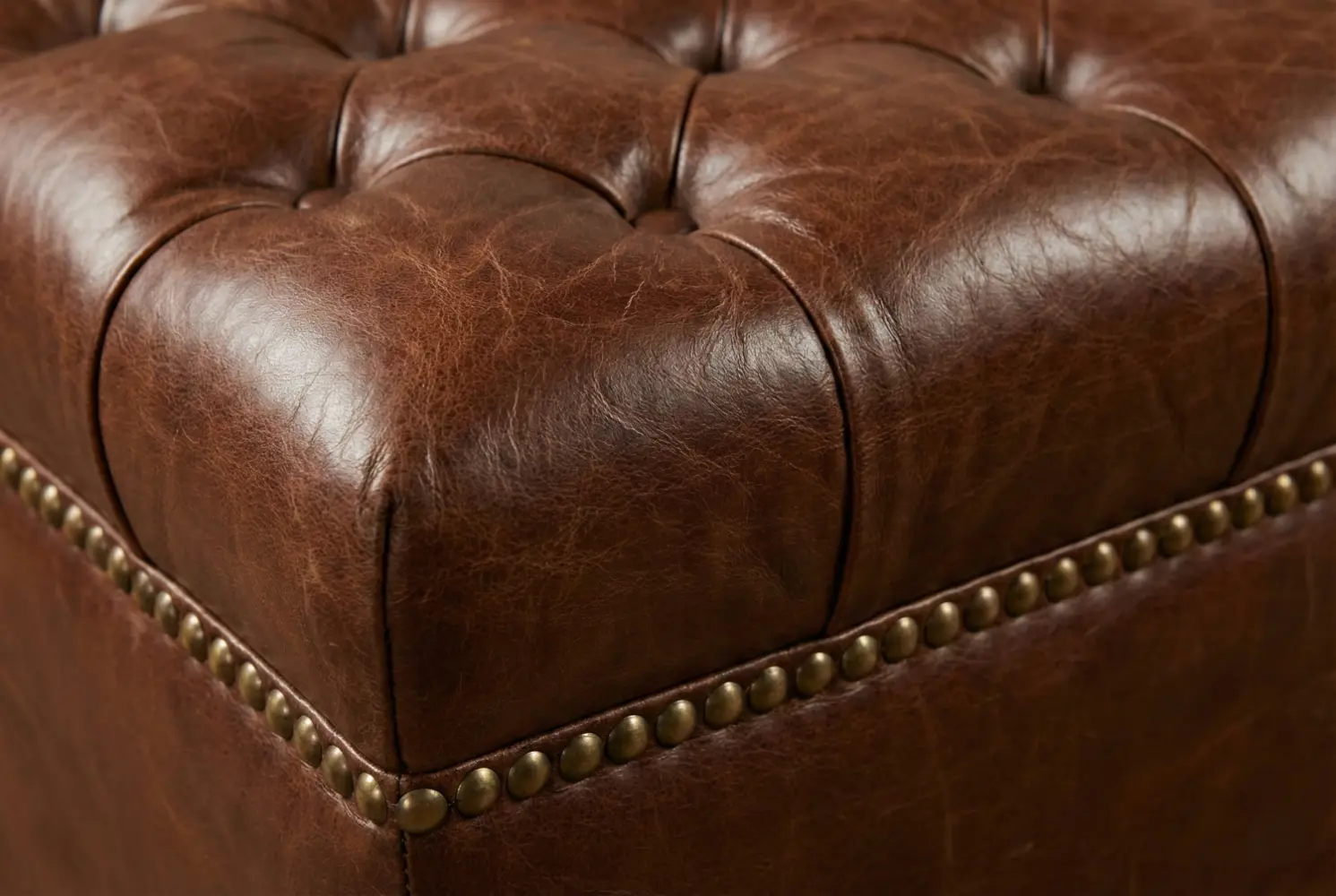 The Nelson Ottoman embodies timeless elegance through its classic deep-button tufting and refined nailhead trim detailing. Its tailored silhouette creates a sophisticated focal point for living rooms, lounges, bedrooms, or formal seating areas. Shown here in rich distressed leather, the design highlights texture and craftsmanship while maintaining a versatile form suited to both traditional and transitional interiors.