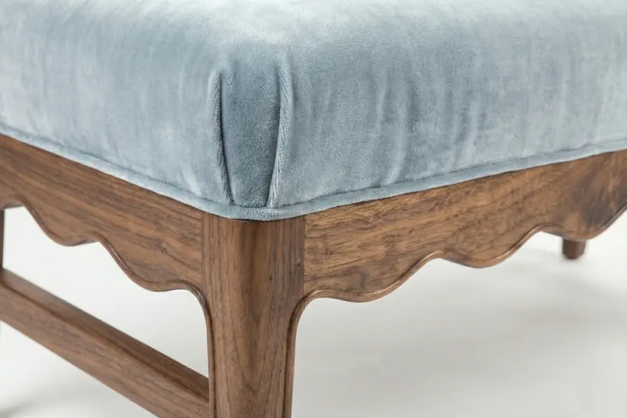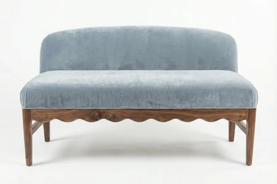 The Sonata Settee presents a refined silhouette defined by its gracefully scalloped wooden apron and elegantly tapered legs. A gently curved, armless back and plush, tightly upholstered seat create a balance of comfort and sculptural sophistication, making it an inviting accent for bedrooms, dressing areas, or refined living spaces.