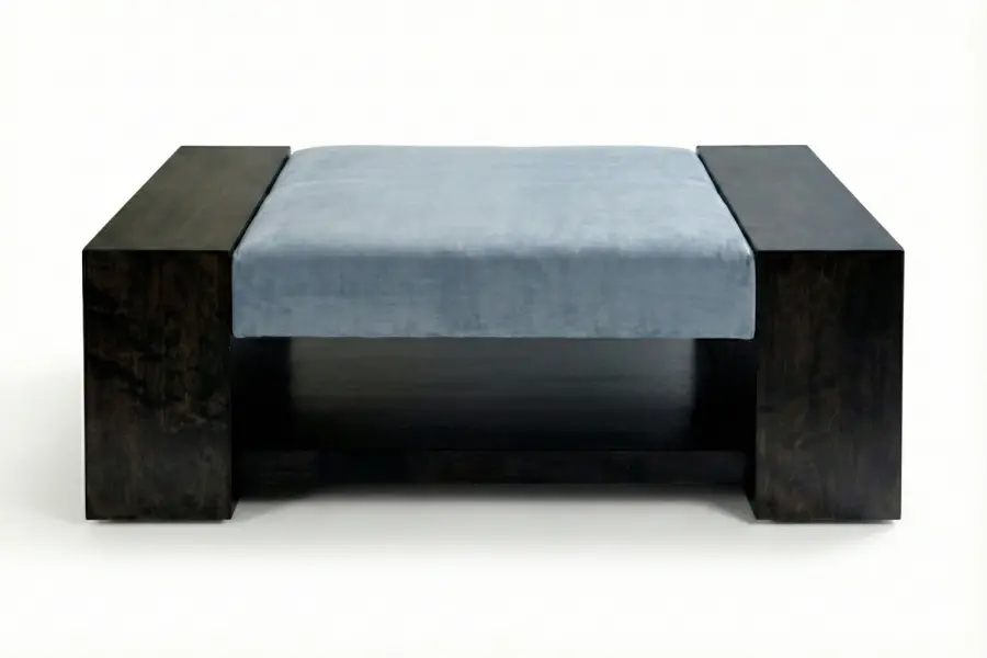 The Vestry Ottoman Bench is a bold architectural design that unites sculptural wooden elements with refined upholstered comfort. Two substantial, dark-finished wood blocks frame a central plush cushion, creating a distinctive composition that emphasizes geometry, contrast, and structural clarity. The result is a modern seating solution well-suited for entryways, living spaces, bedrooms, or contemporary hospitality interiors.